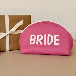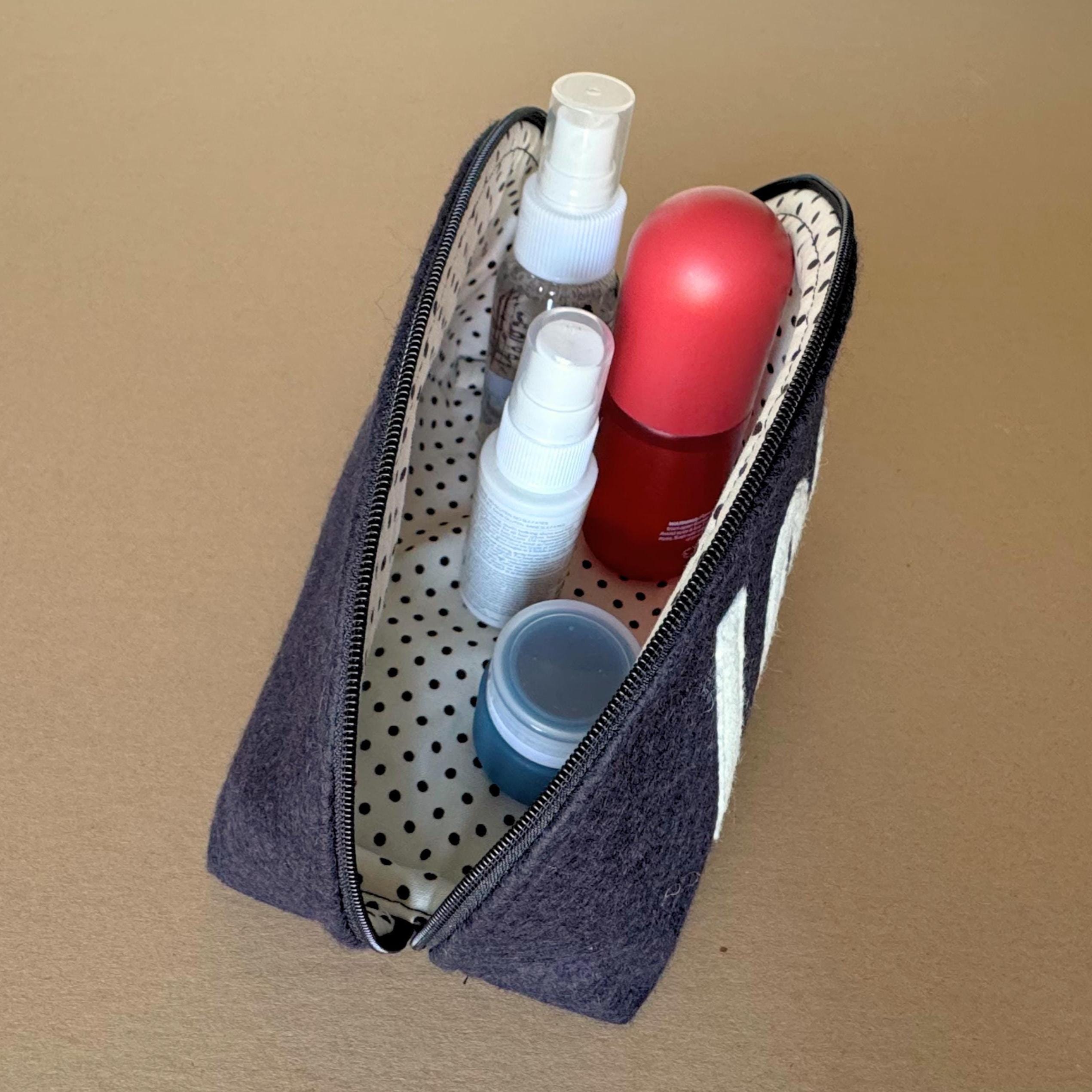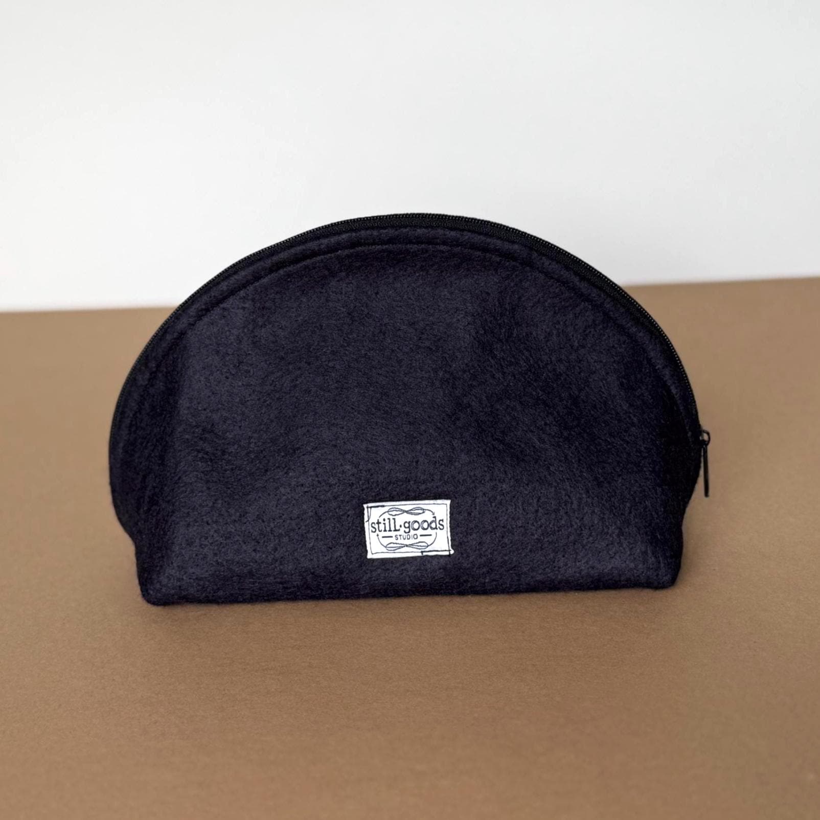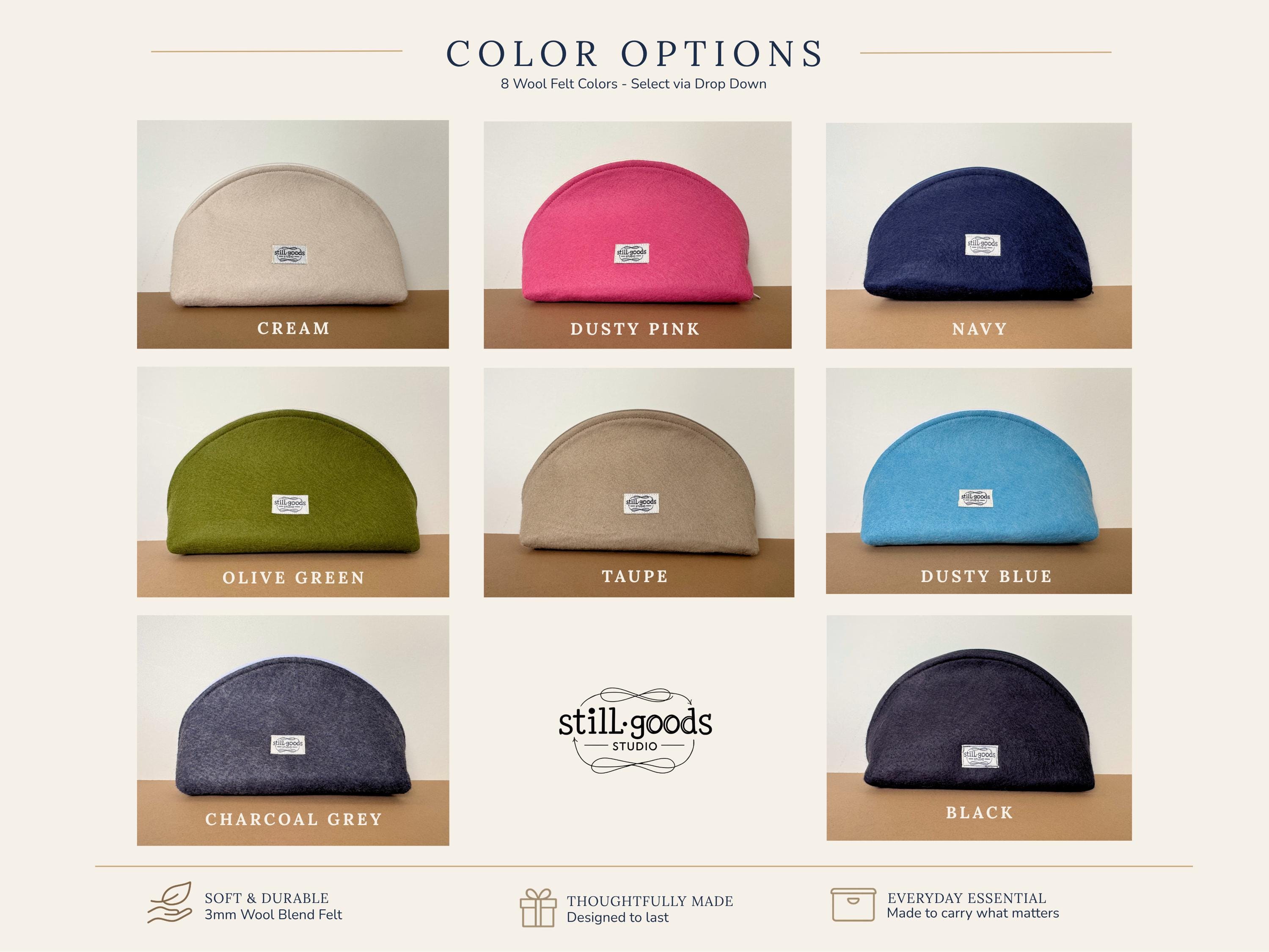 ❖ FEATURES • Distinctive half-dome silhouette — stands upright on its own • Wool blend felt LOVE appliqué, hand-applied and stitched • Cotton interior lining — fully finished • Coordinating zipper with easy pull tab. • Approx. 9" wide × 5 1/2" tall x 3 3/4" deep • Fits makeup essentials, art supplies, travel bits, or cords and chargers