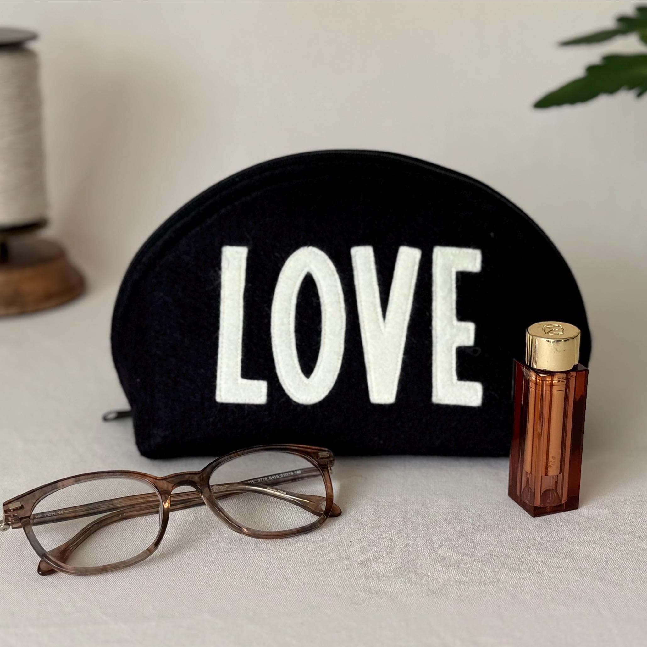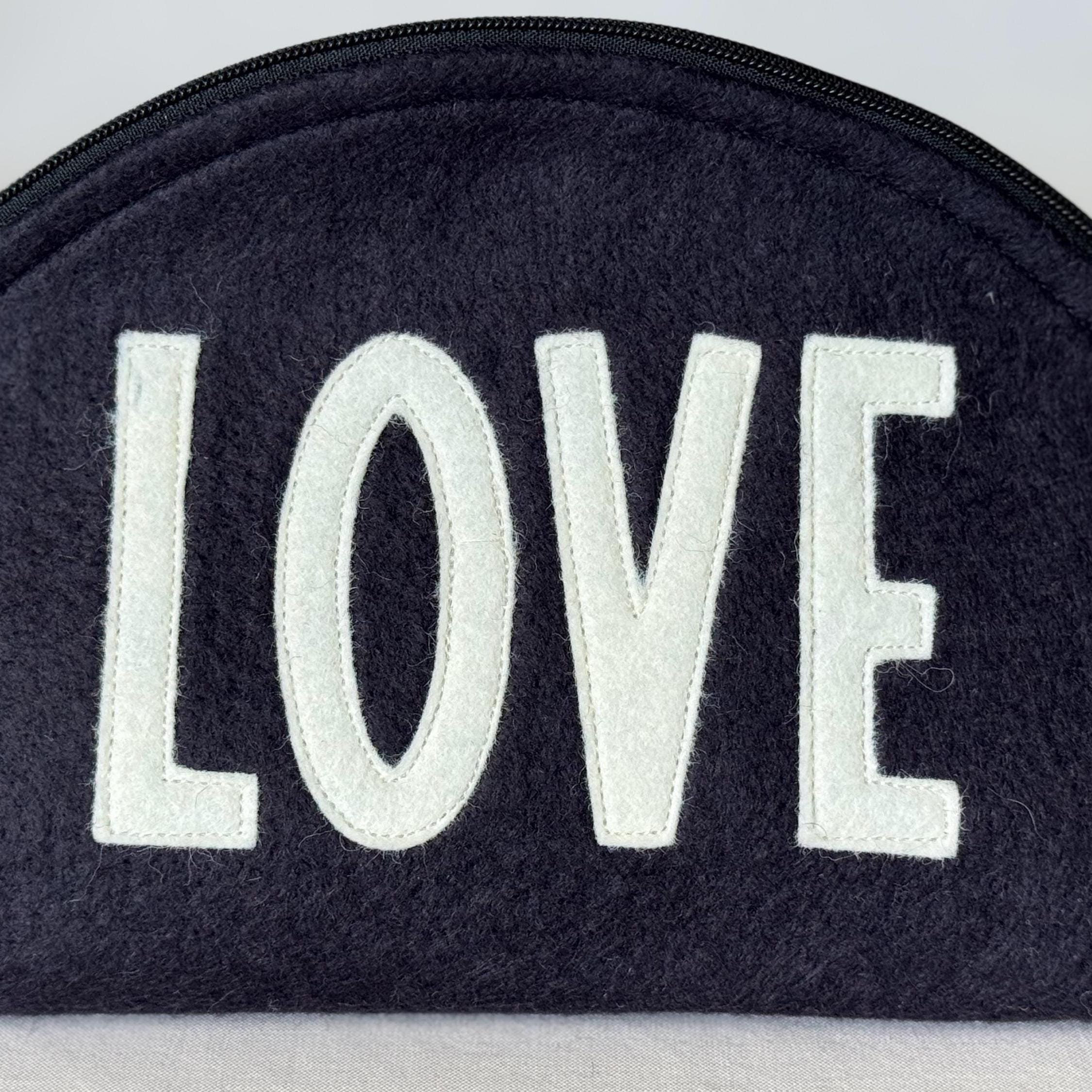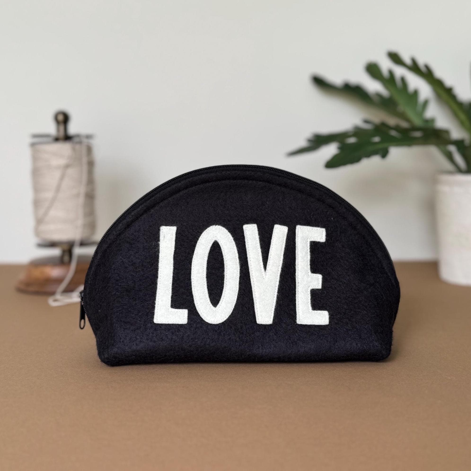 Black with bold letters. This black wool blend felt pouch wears the word LOVE in crisp white appliqué — a classic, confident combination that works for any occasion. Compact, upright, and made to last.