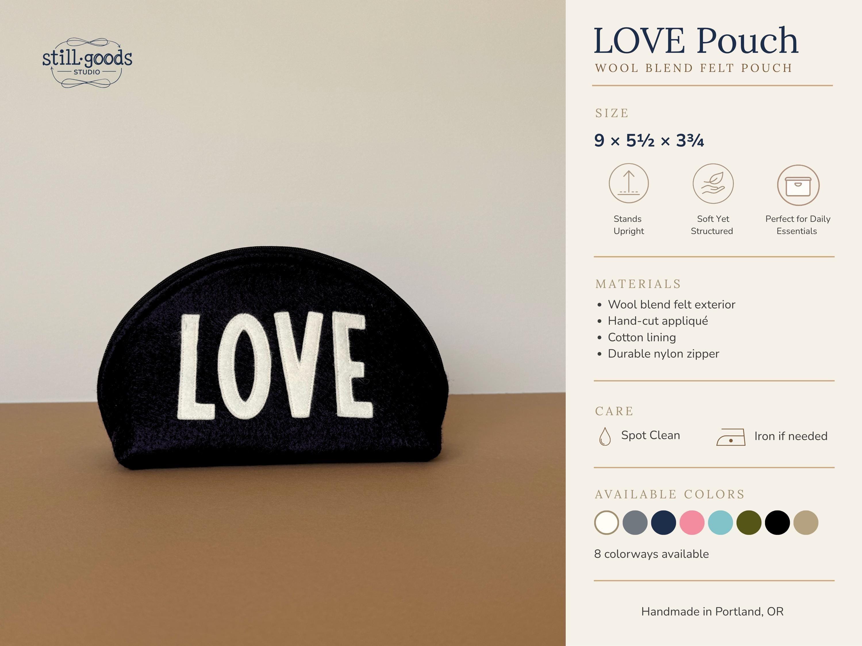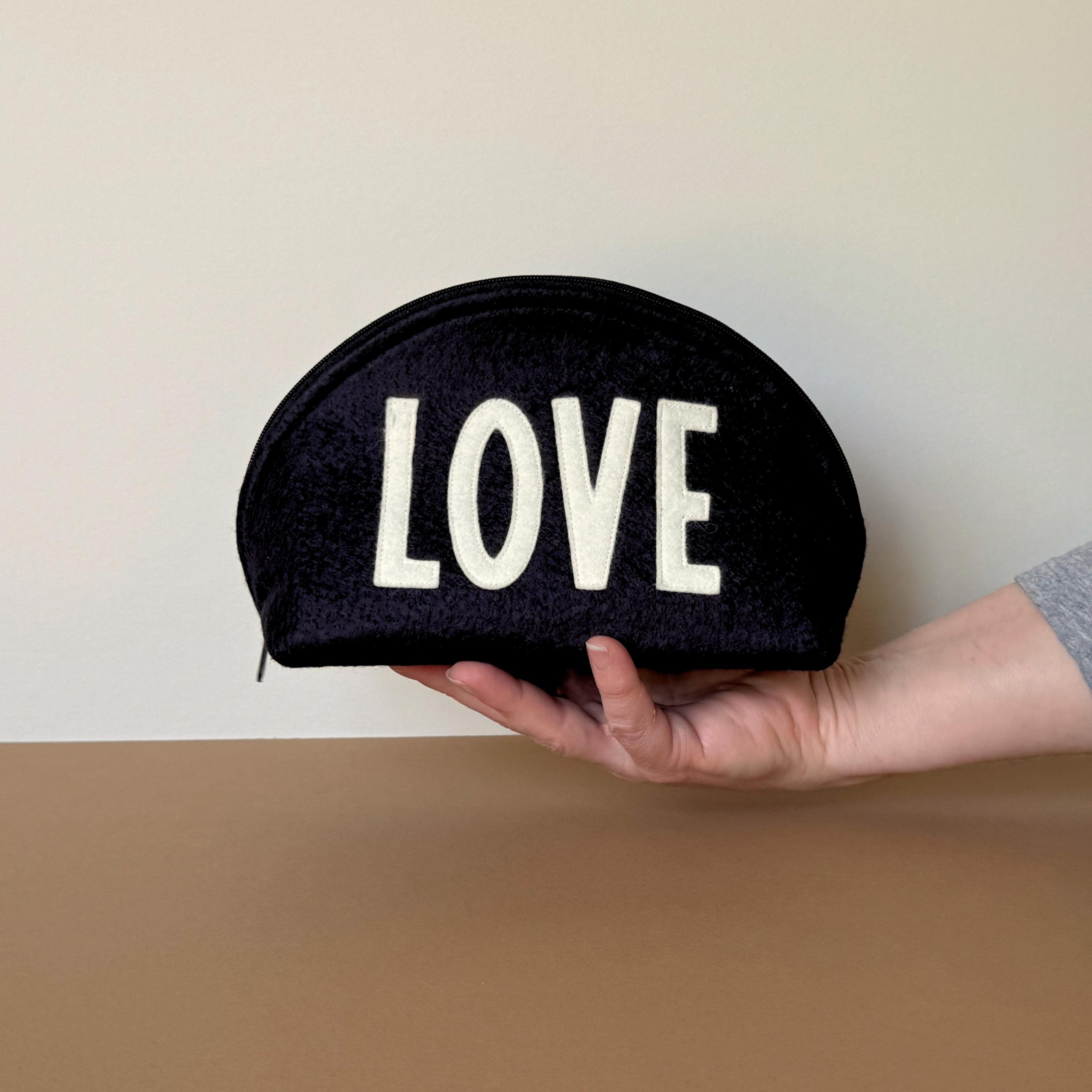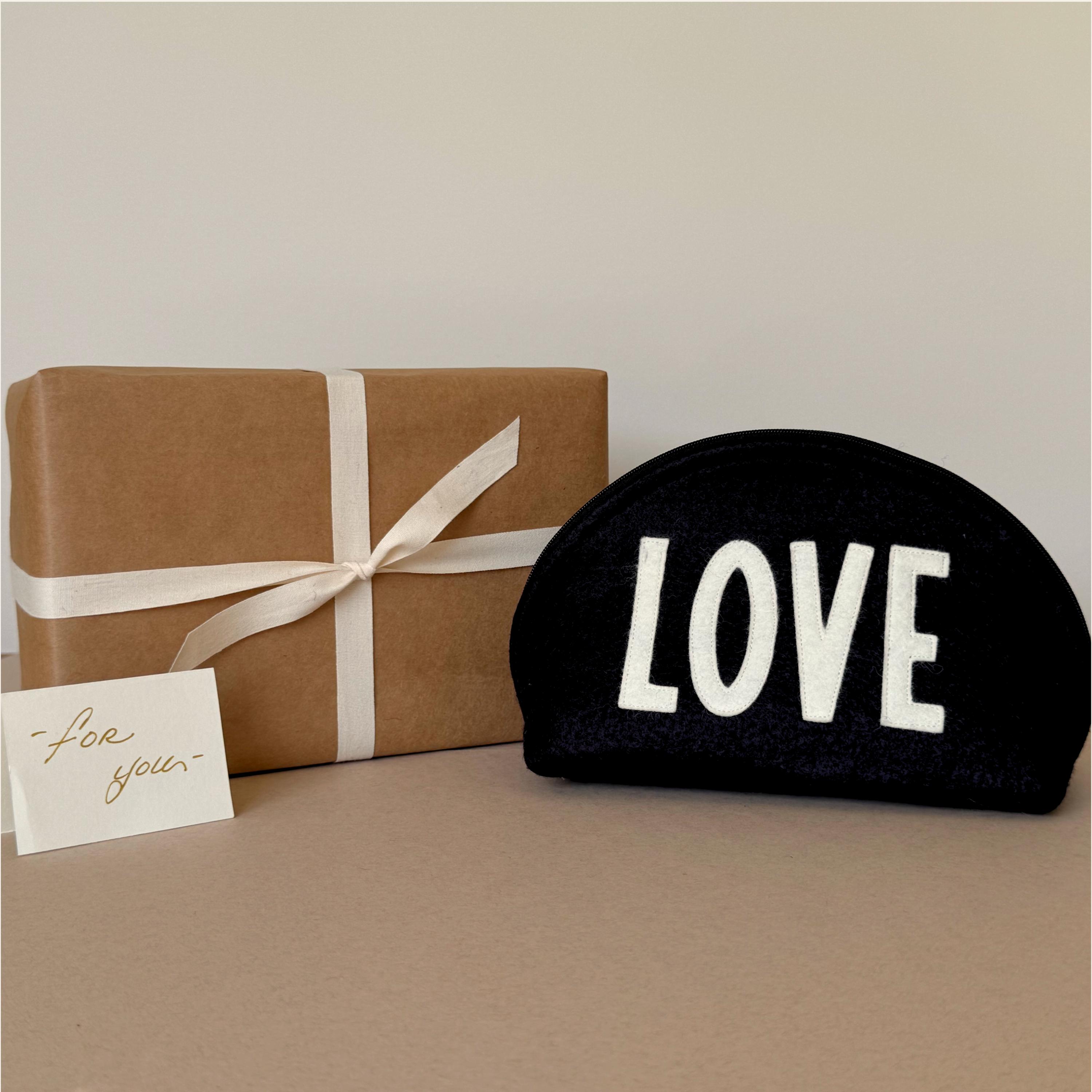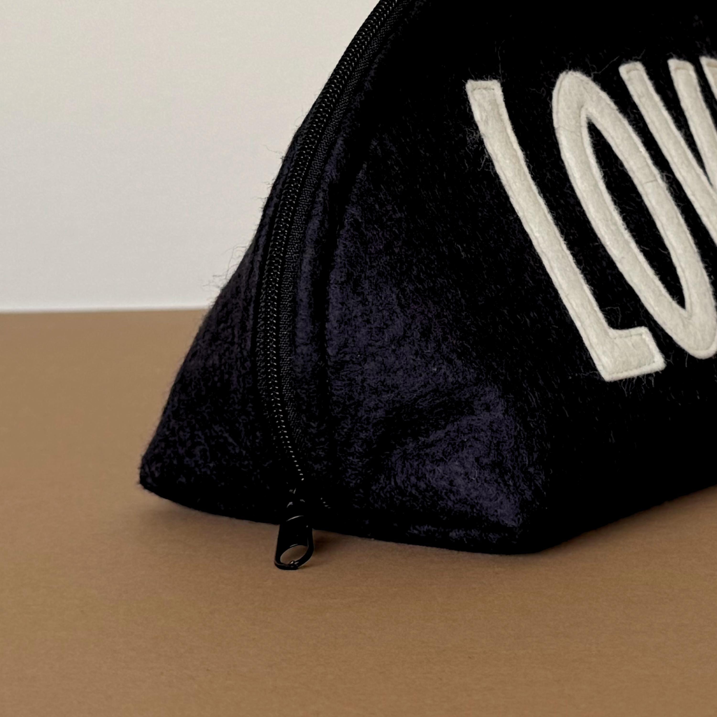 Black with bold letters. This black wool blend felt pouch wears the word LOVE in crisp white appliqué — a classic, confident combination that works for any occasion. Compact, upright, and made to last.