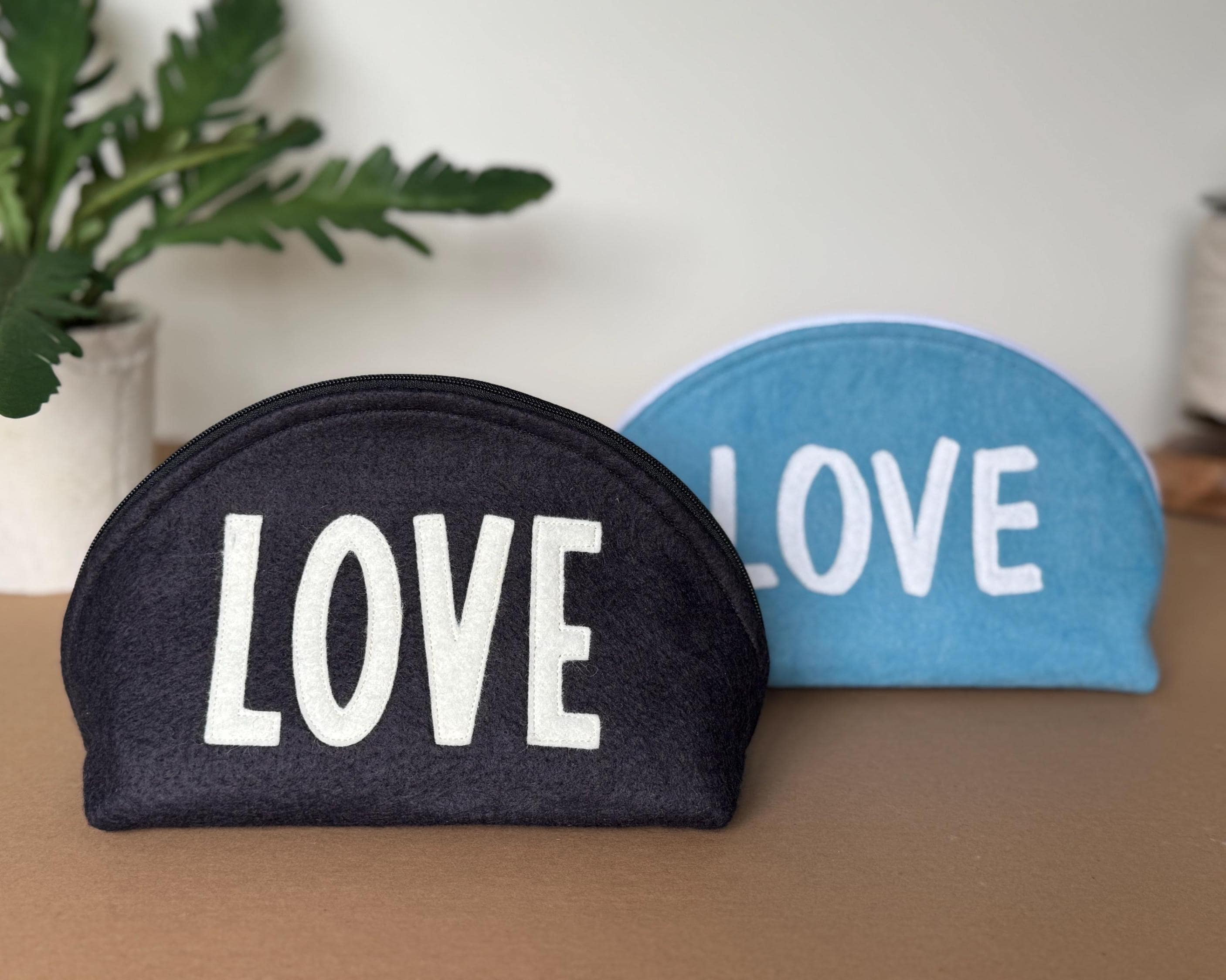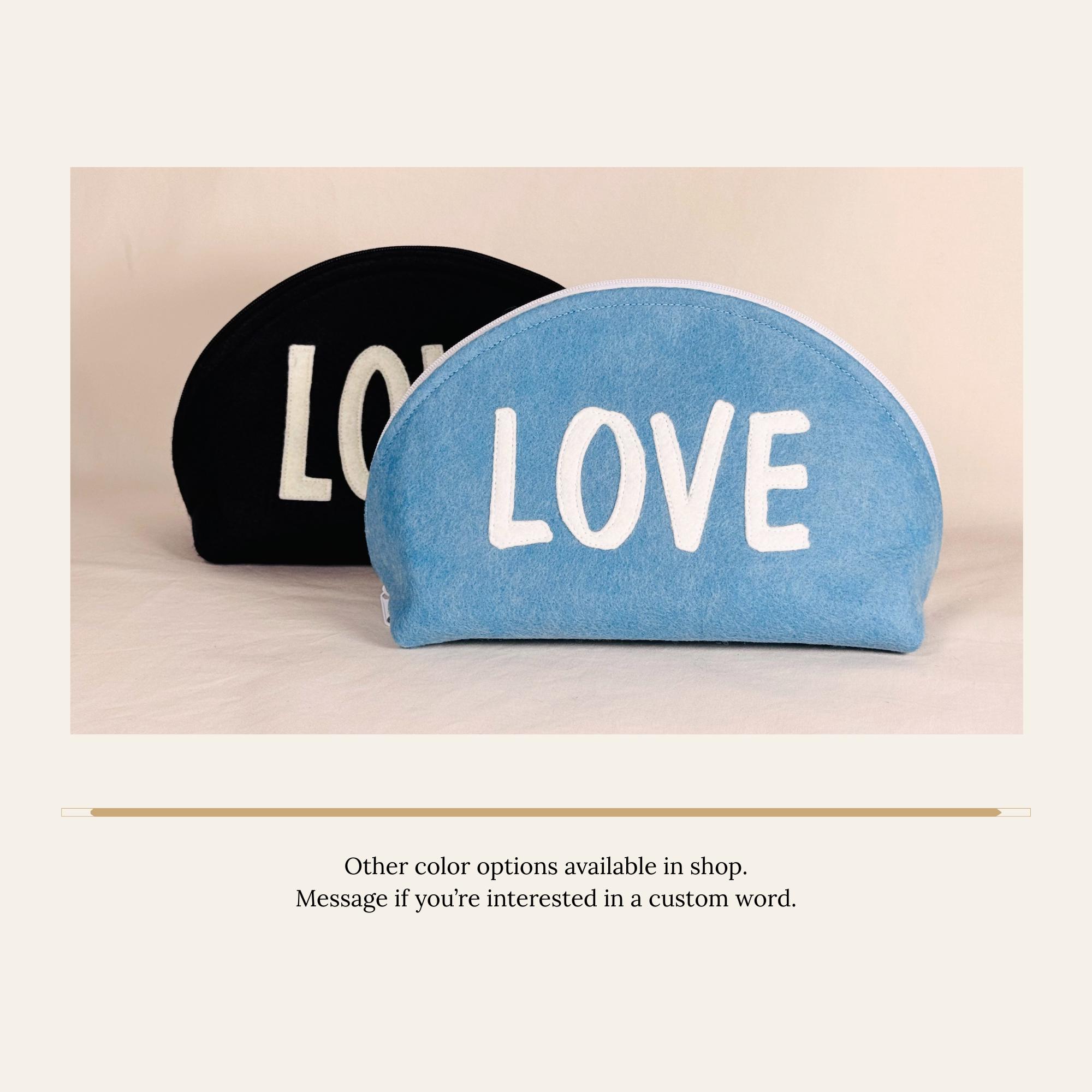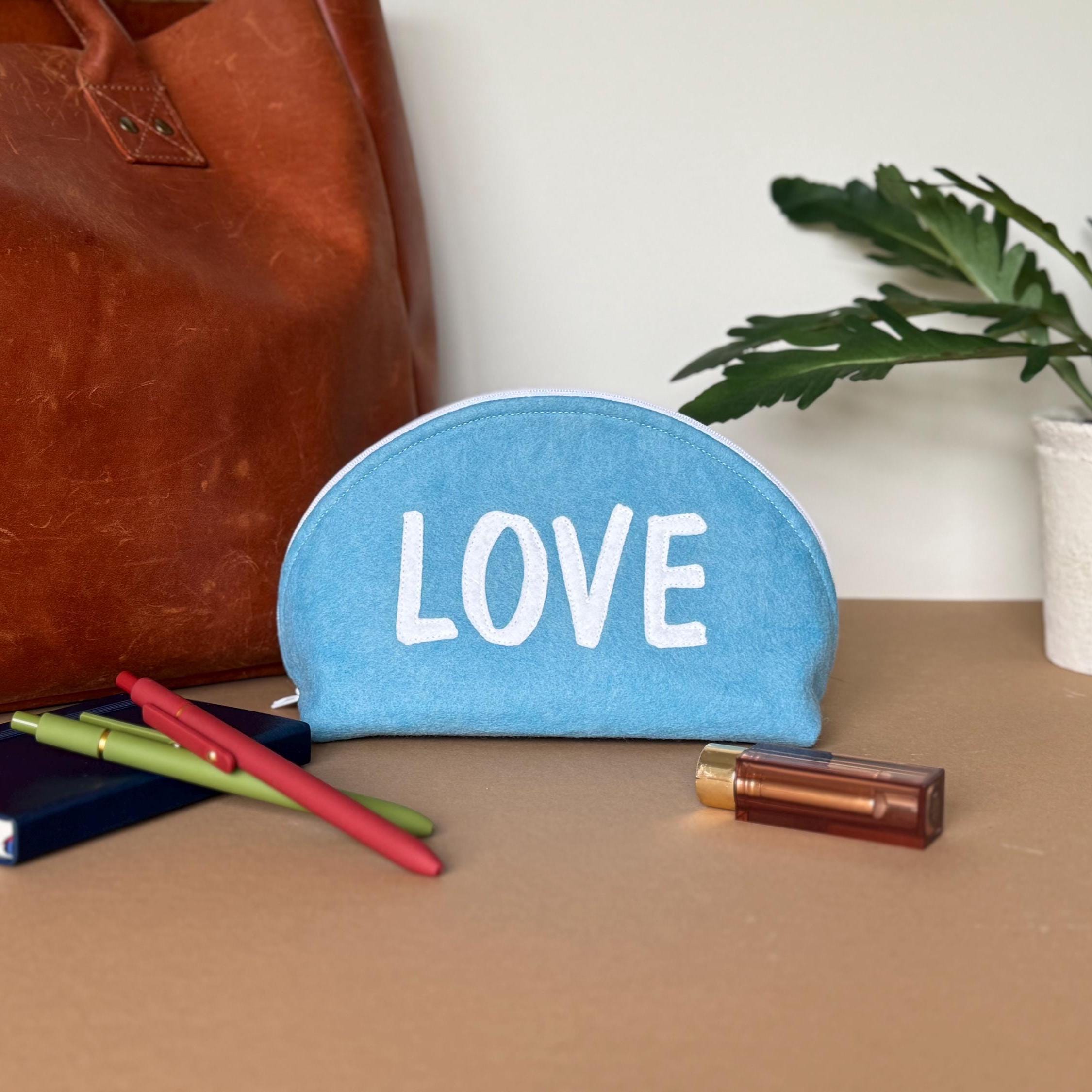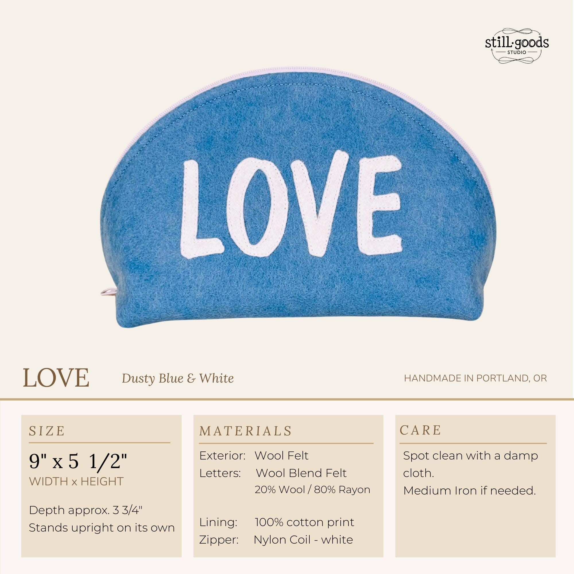 ❖ FEATURES • Distinctive half-dome silhouette — stands upright on its own • White wool blend felt LOVE appliqué, hand-applied and stitched • White zipper with easy-pull tab • Blue and white print interior lining • Approx. 9" wide × 5 1/2" tall • Fits makeup, pencils, jewelry, cables, or everyday small essentials