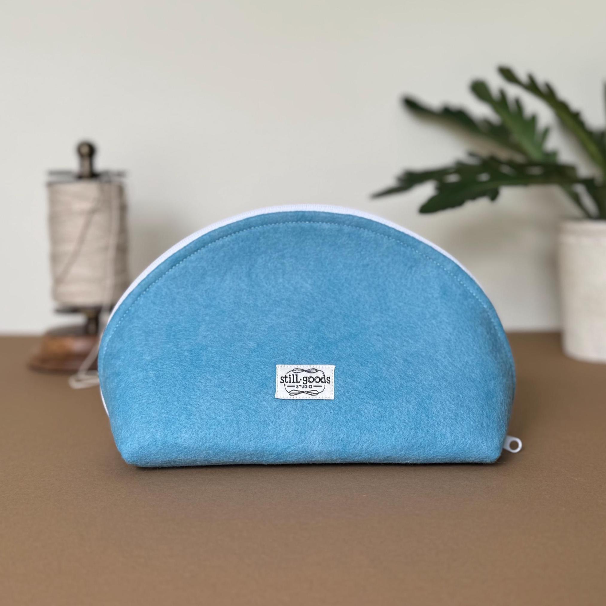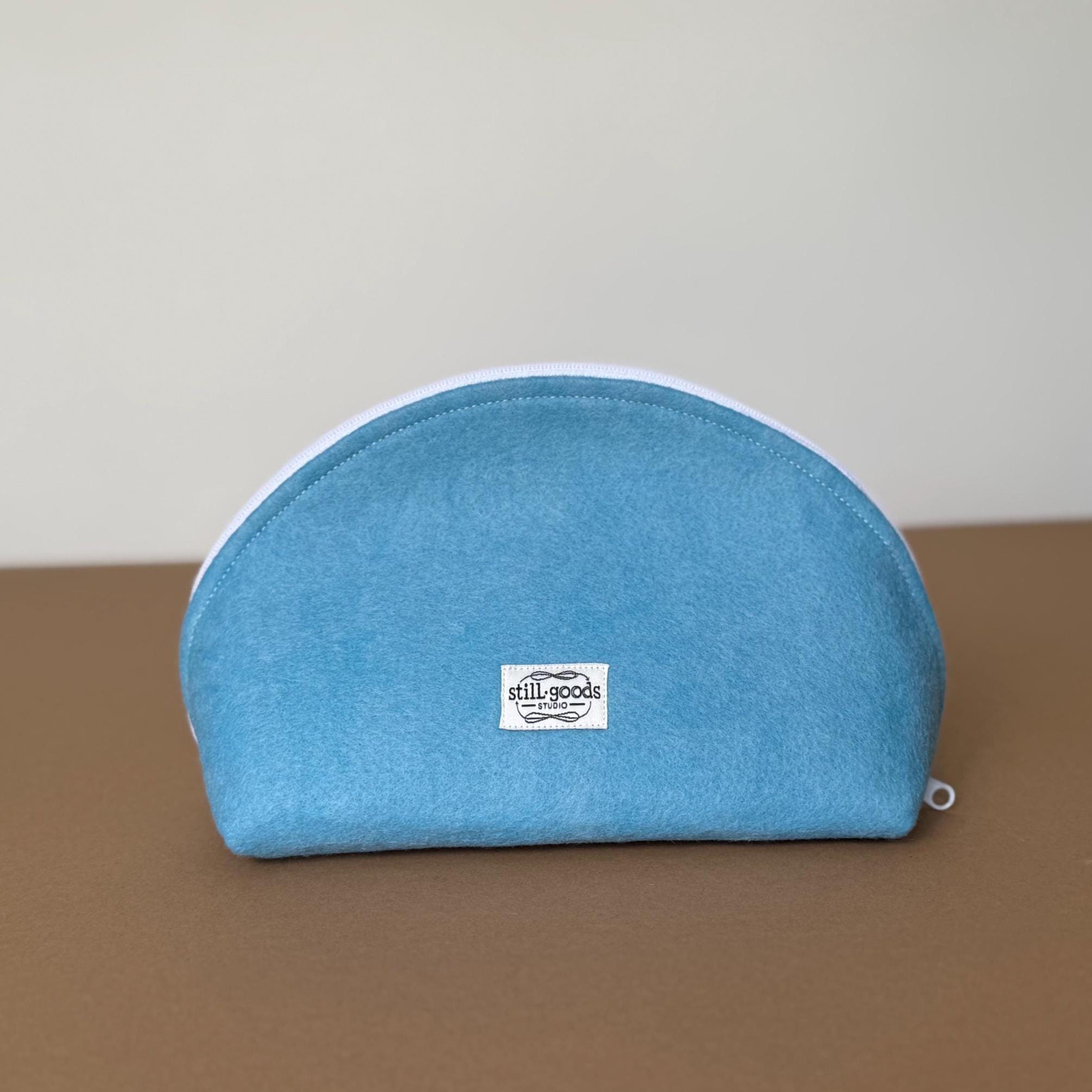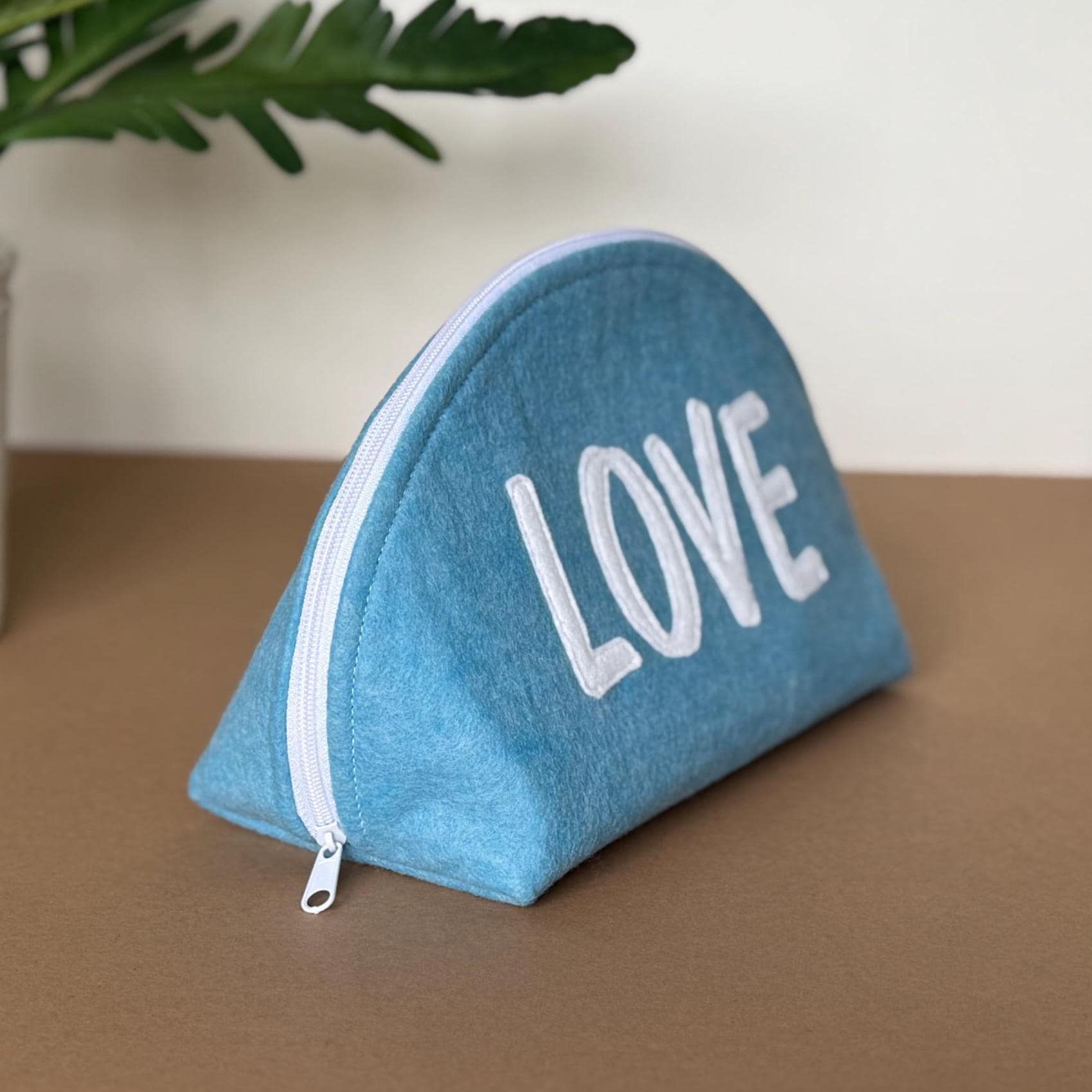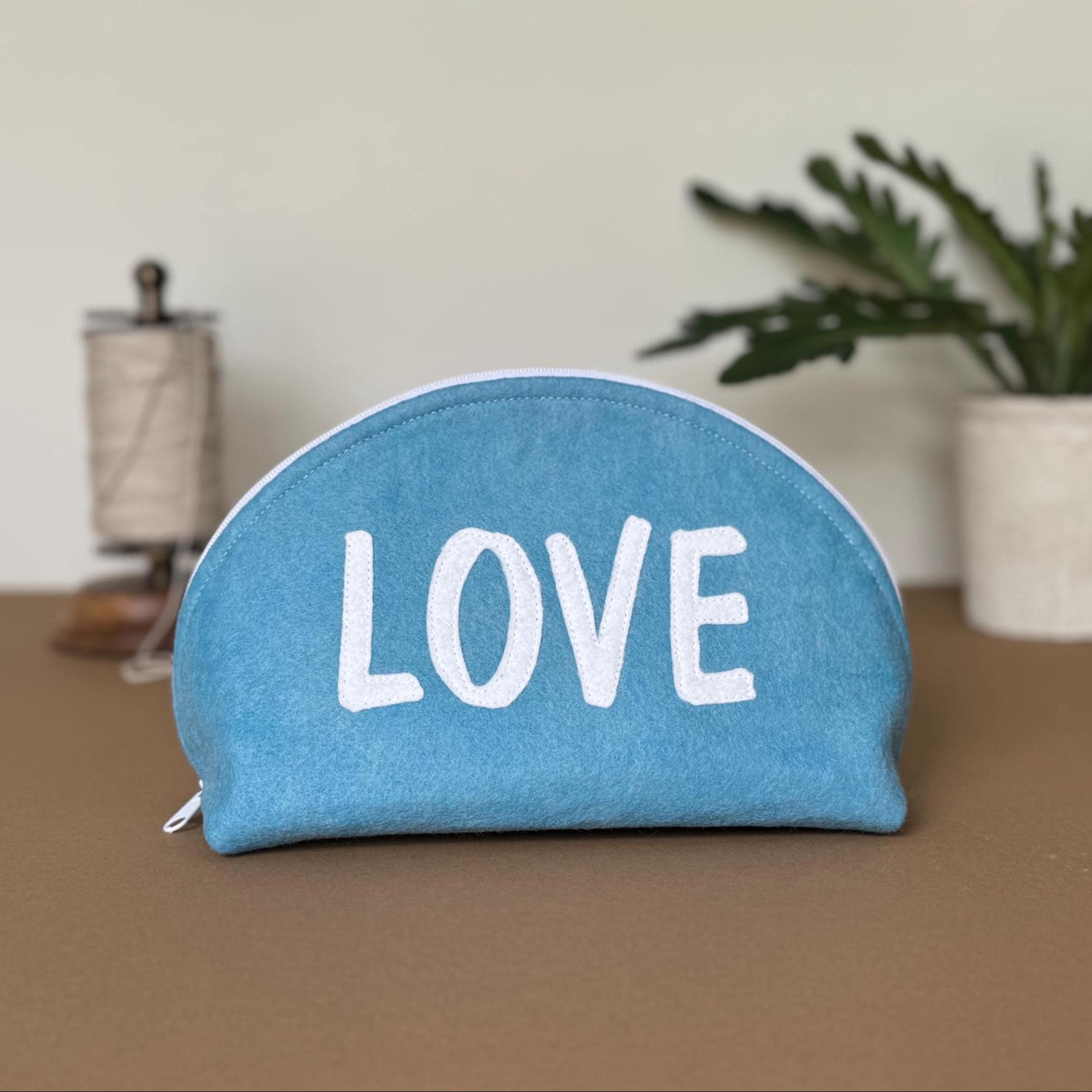 ❖ FEATURES • Distinctive half-dome silhouette — stands upright on its own • White wool blend felt LOVE appliqué, hand-applied and stitched • White zipper with easy-pull tab • Blue and white print interior lining • Approx. 9" wide × 5 1/2" tall • Fits makeup, pencils, jewelry, cables, or everyday small essentials