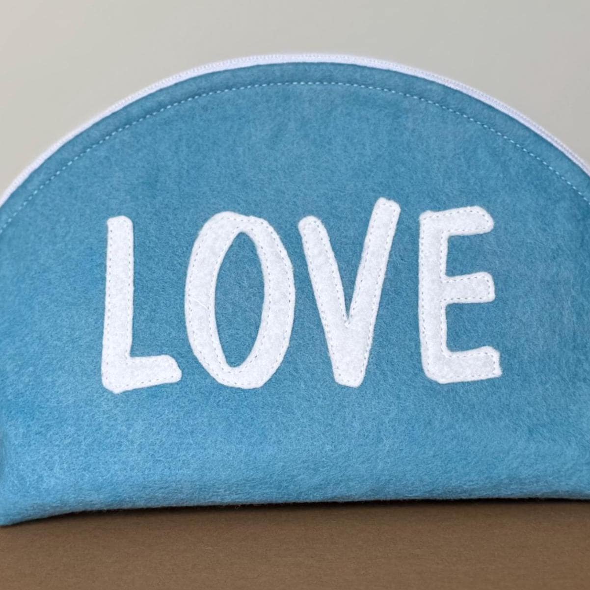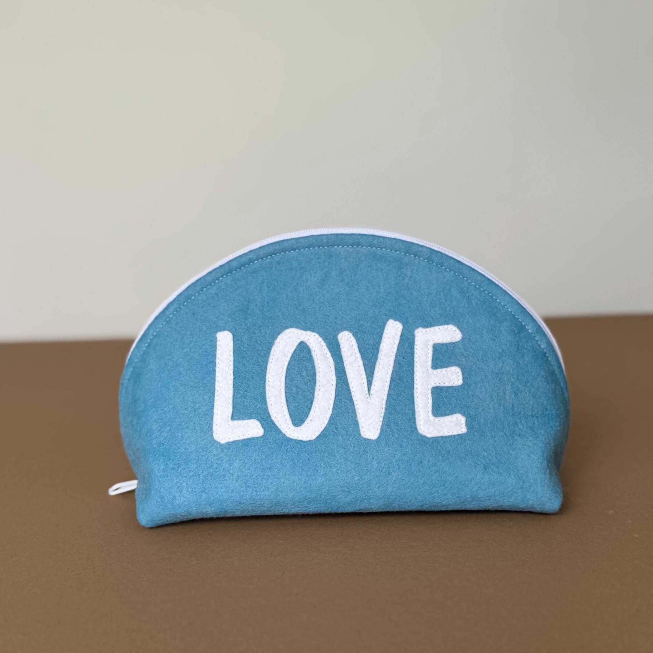 Soft and quiet. This dusty blue wool felt pouch wears the word LOVE in white appliqué — understated and lovely, like a handwritten note in the best possible way. The muted blue tone makes it feel fresh without being loud.