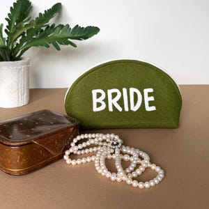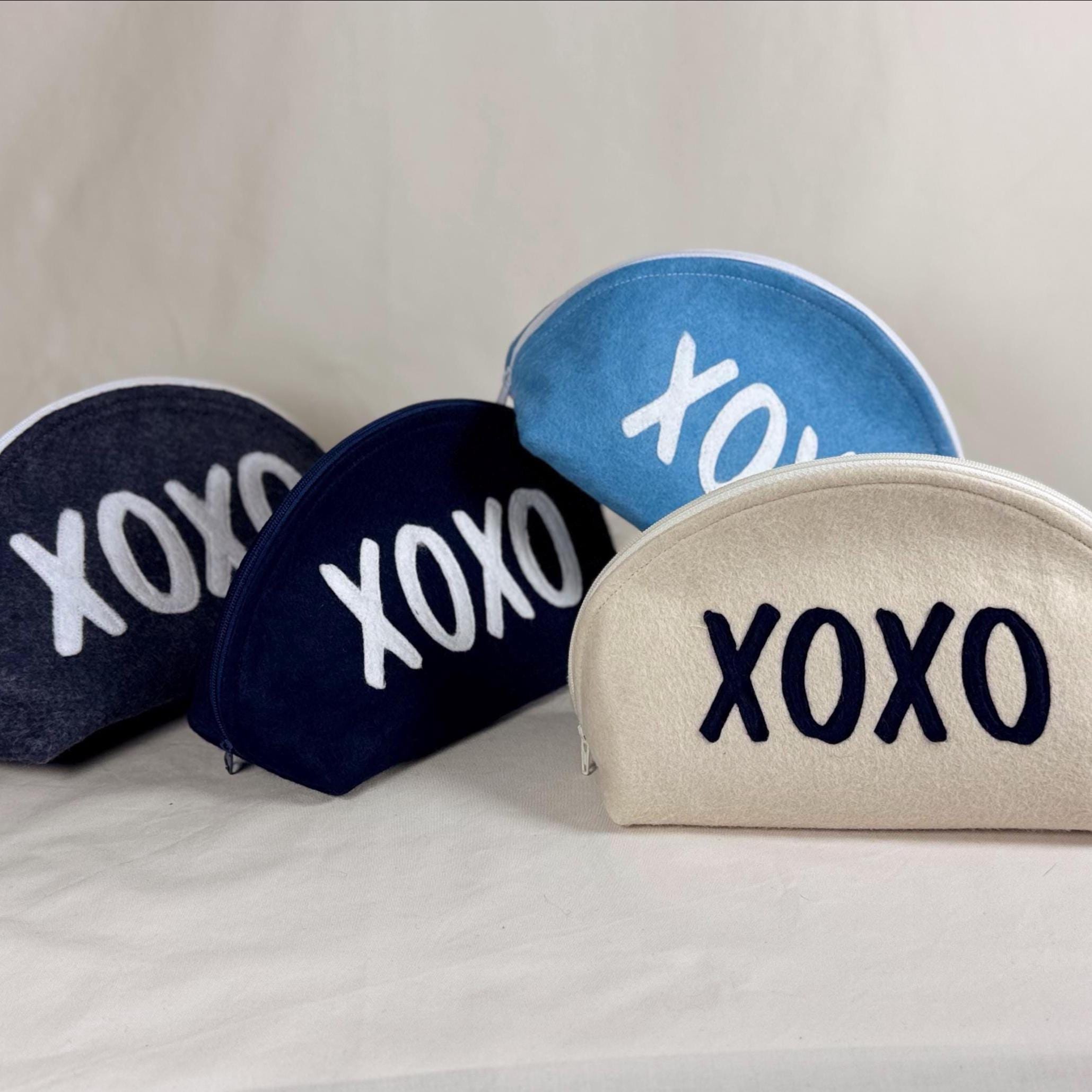 ❖ FEATURES • Distinctive half-dome silhouette — stands upright on its own • White wool blend felt XOXO appliqué, hand-applied and stitched • White zipper with easy-pull tab • Soft botanical-print interior lining • Approx. 9" wide × 5 1/2" tall • Roomy enough for makeup essentials, markers, cables, or jewelry