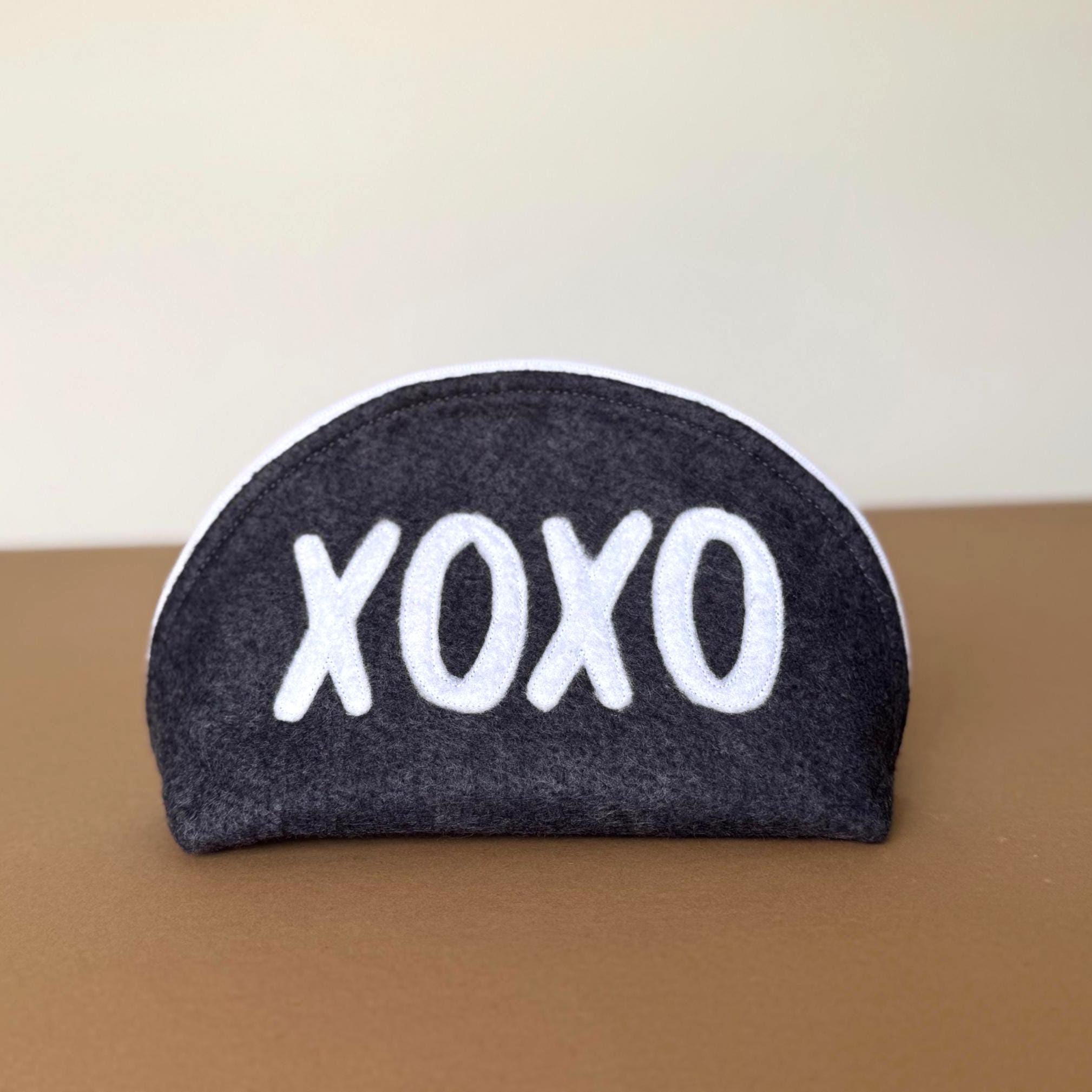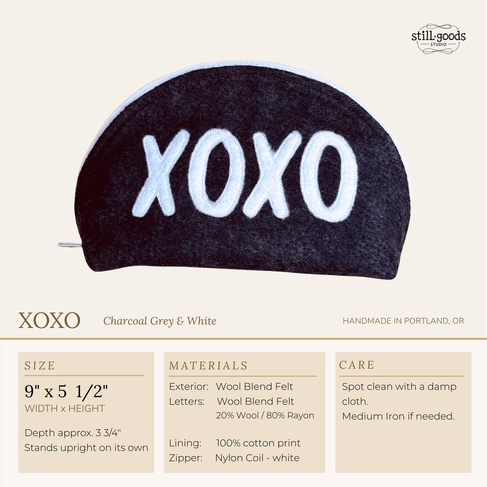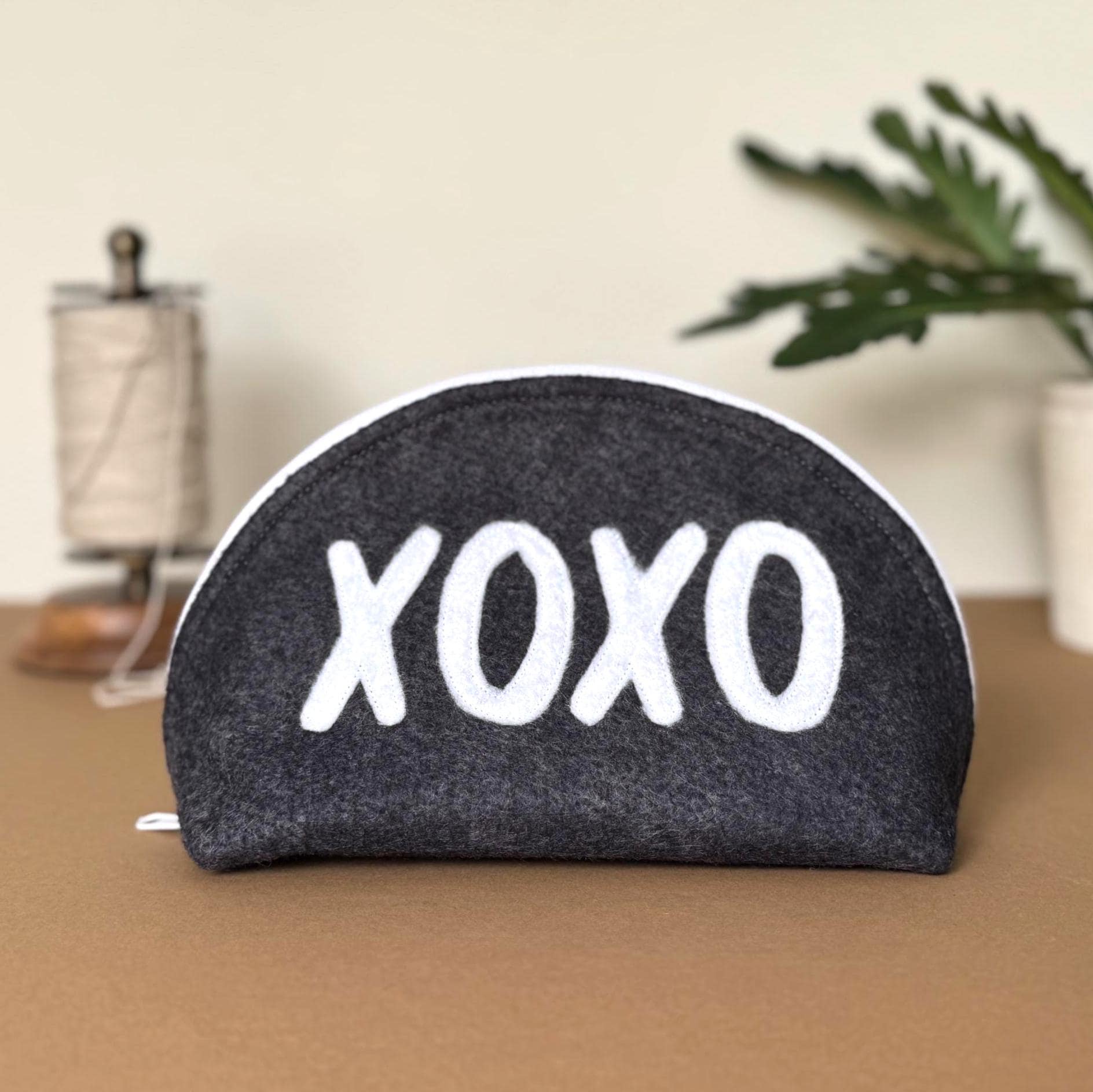 Say it with a pouch. This charcoal grey wool felt zip pouch features a bold XOXO appliqué in white felt — handstitched and made to last. The half-dome shape is compact enough to toss in a bag but roomy enough for your everyday essentials.