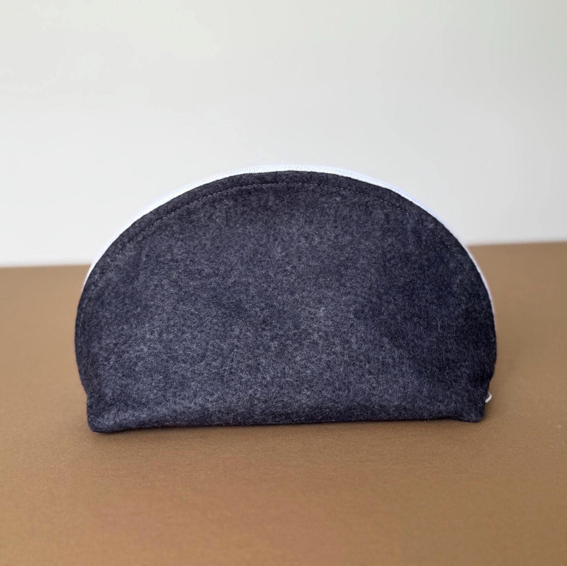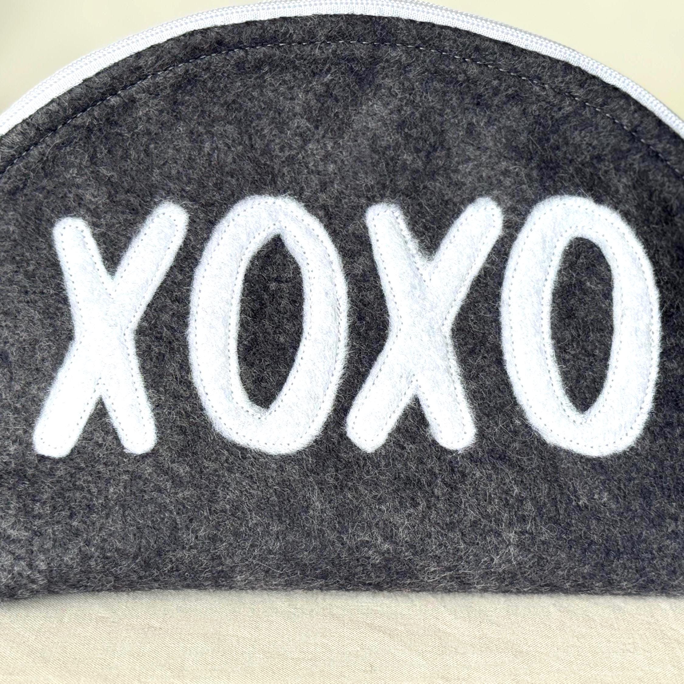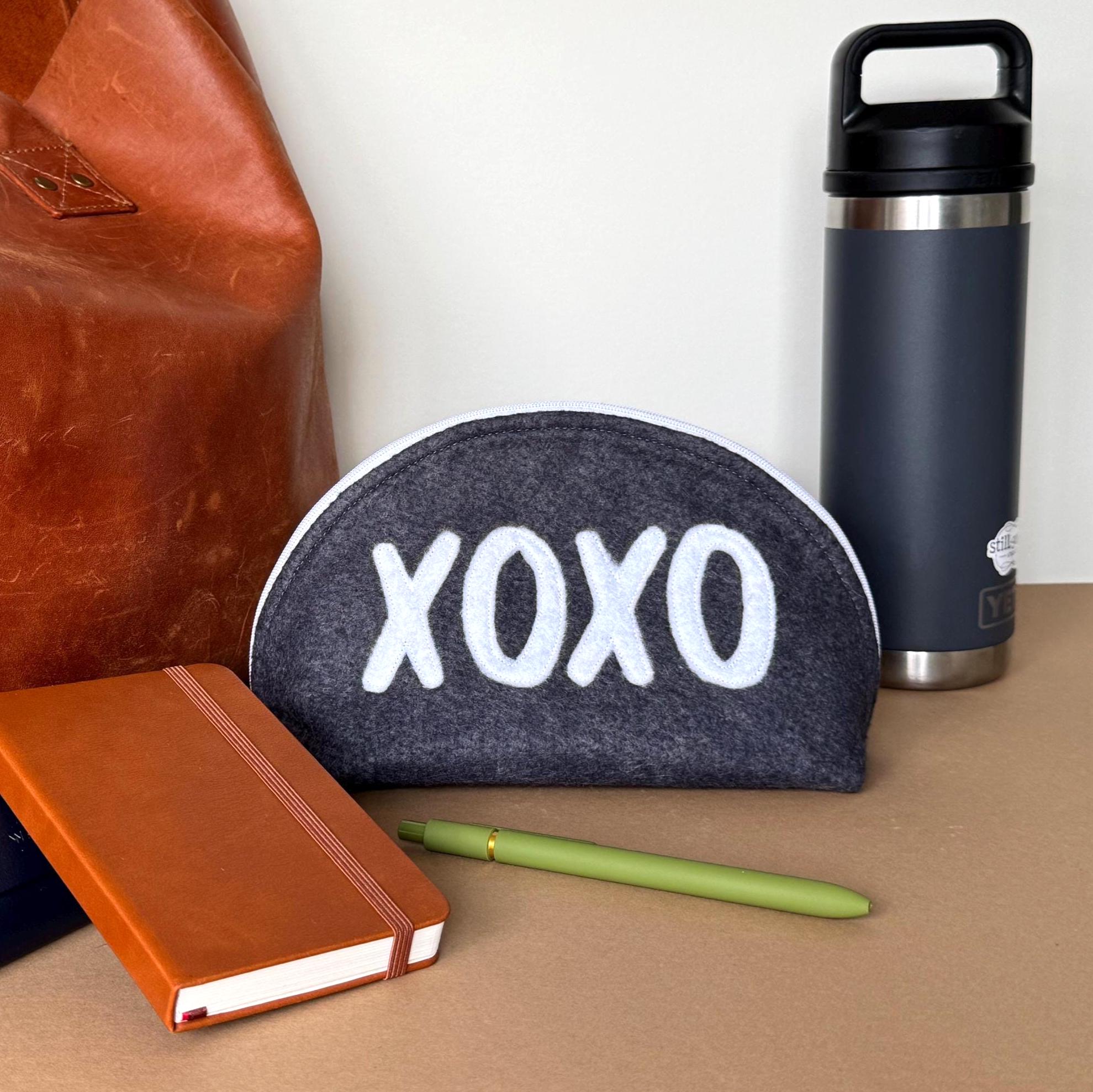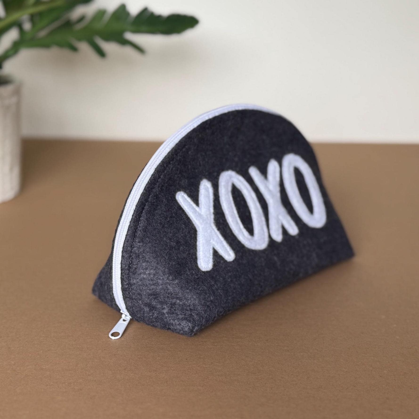 Say it with a pouch. This charcoal grey wool felt zip pouch features a bold XOXO appliqué in white felt — handstitched and made to last. The half-dome shape is compact enough to toss in a bag but roomy enough for your everyday essentials.