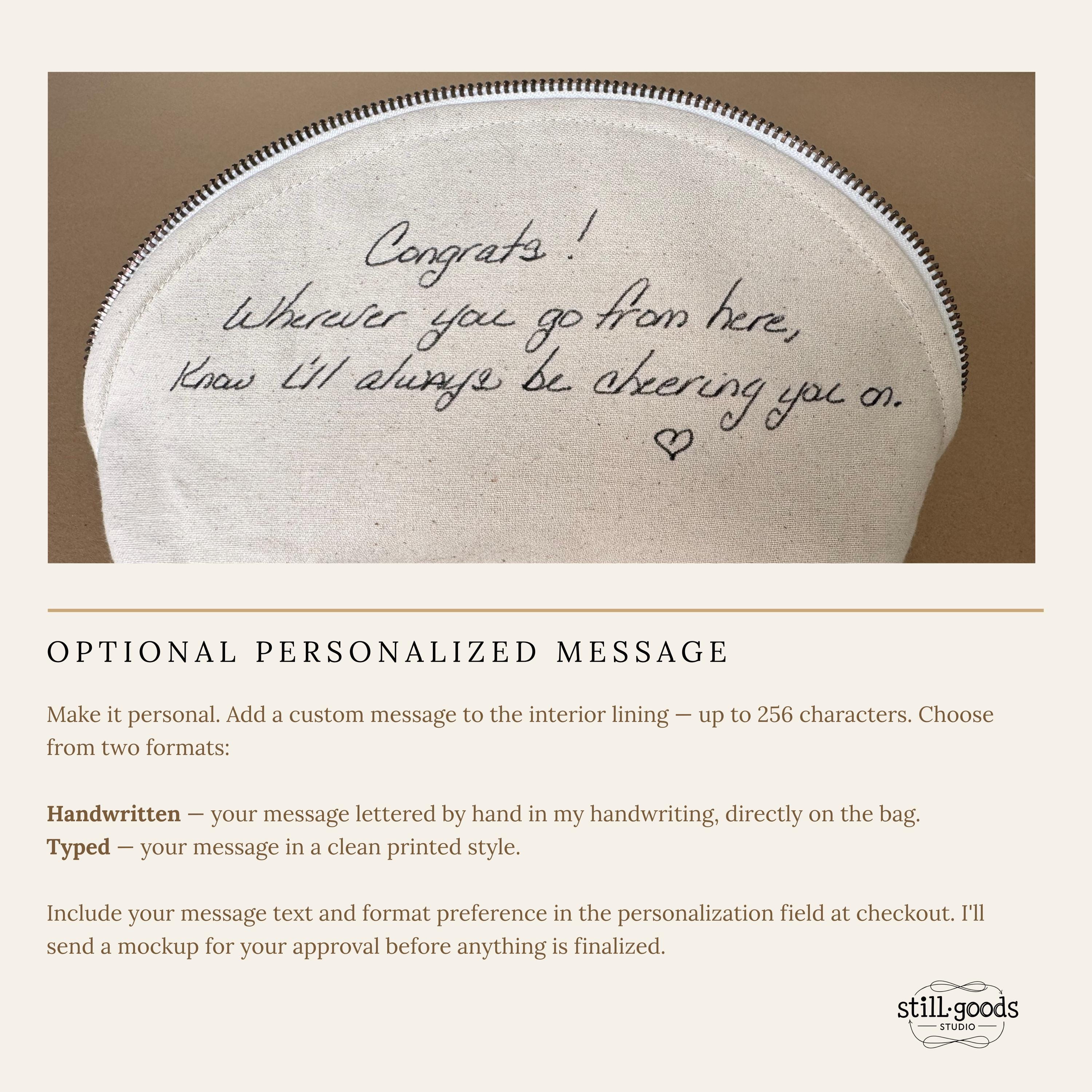 ✦ OPTIONAL INTERIOR MESSAGE Make it personal. Add a handwritten note to the interior lining — your words, written by hand directly on the bag. Just include your message text and format preference in the personalization field at checkout. I'll send a mockup for your approval before anything is finalized.