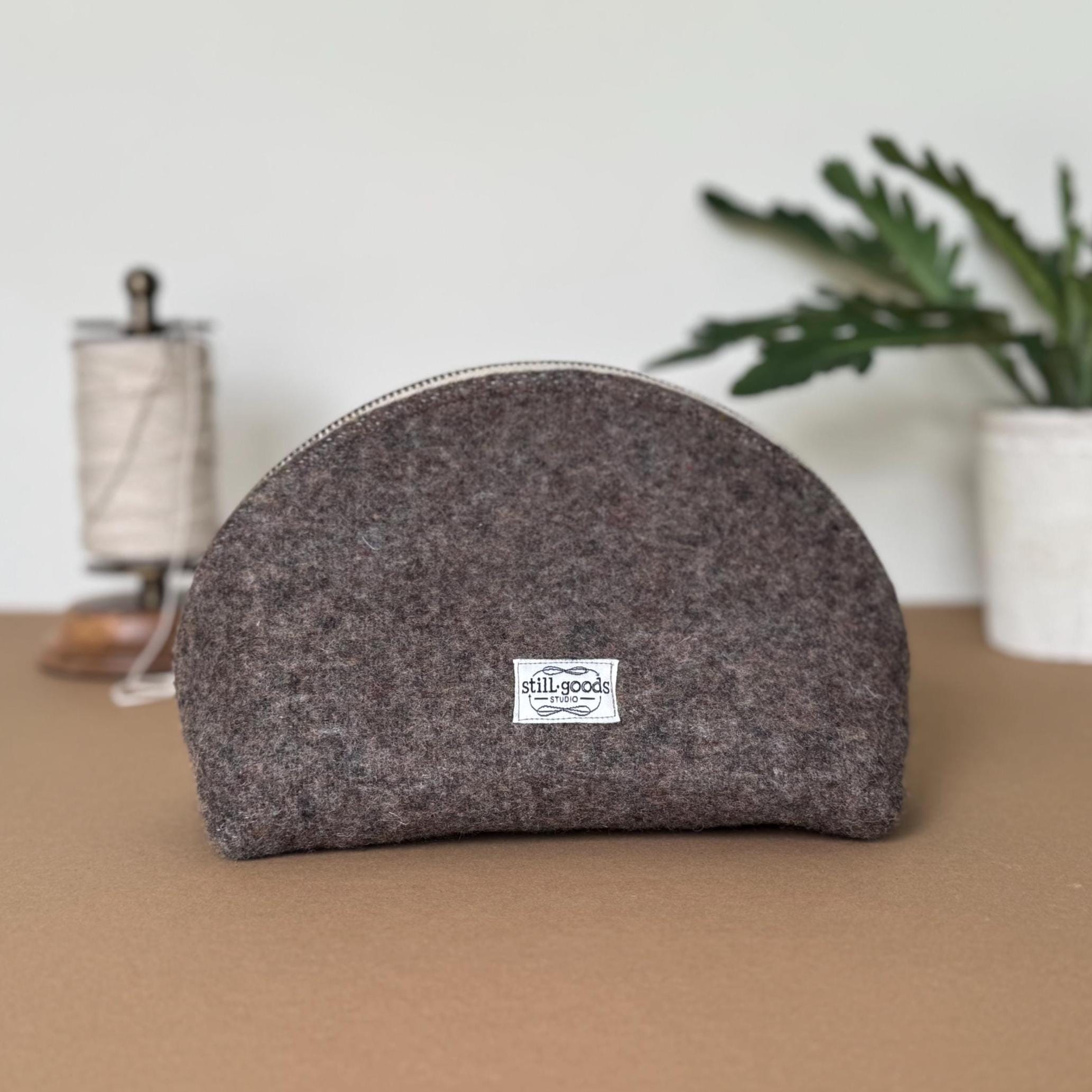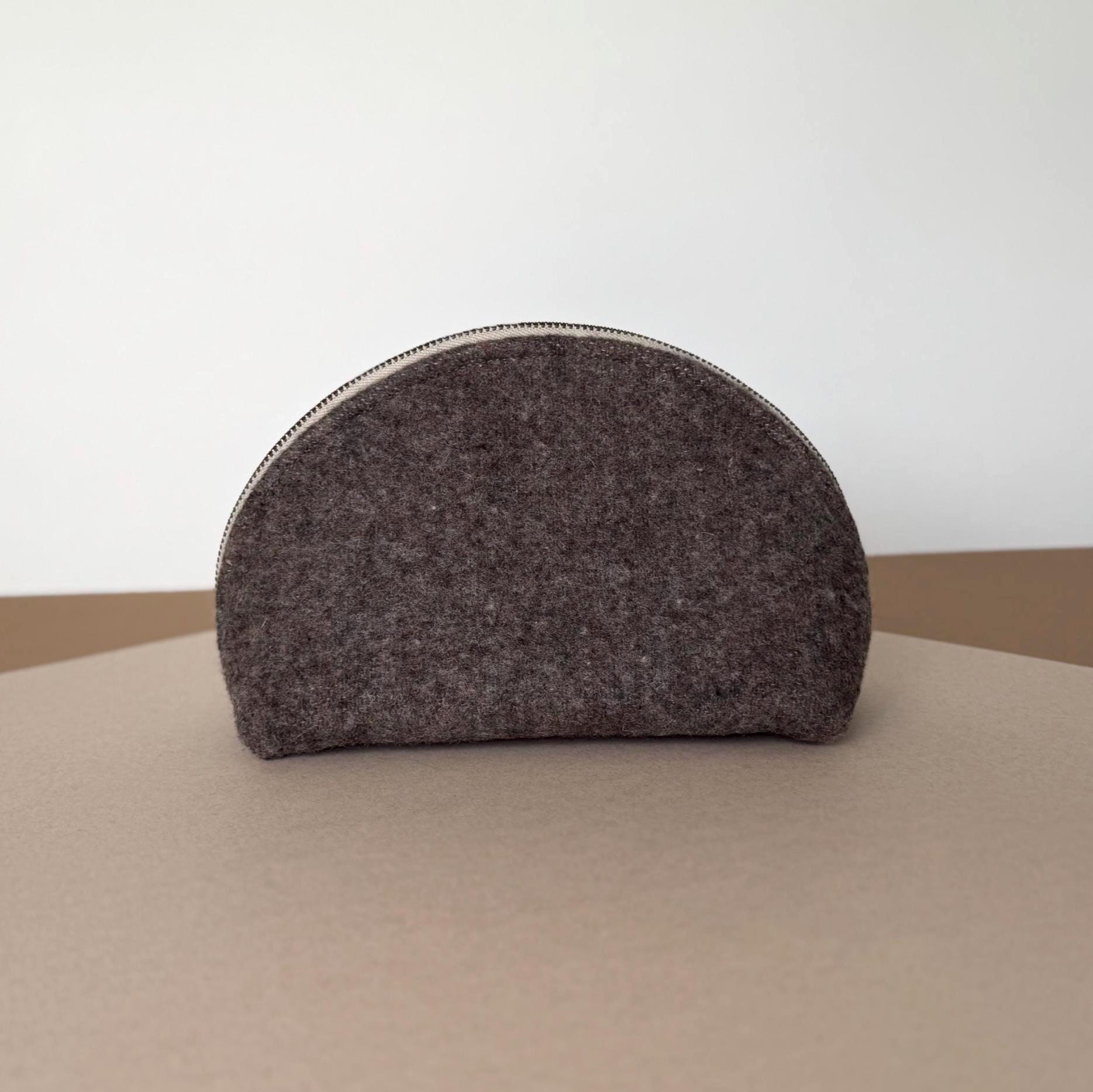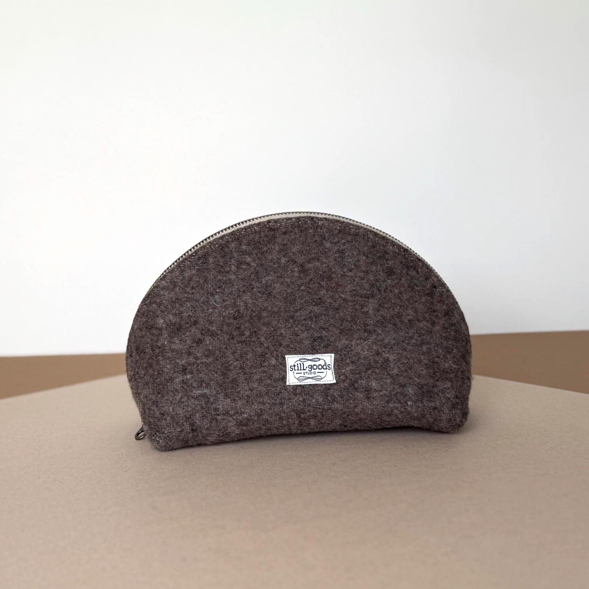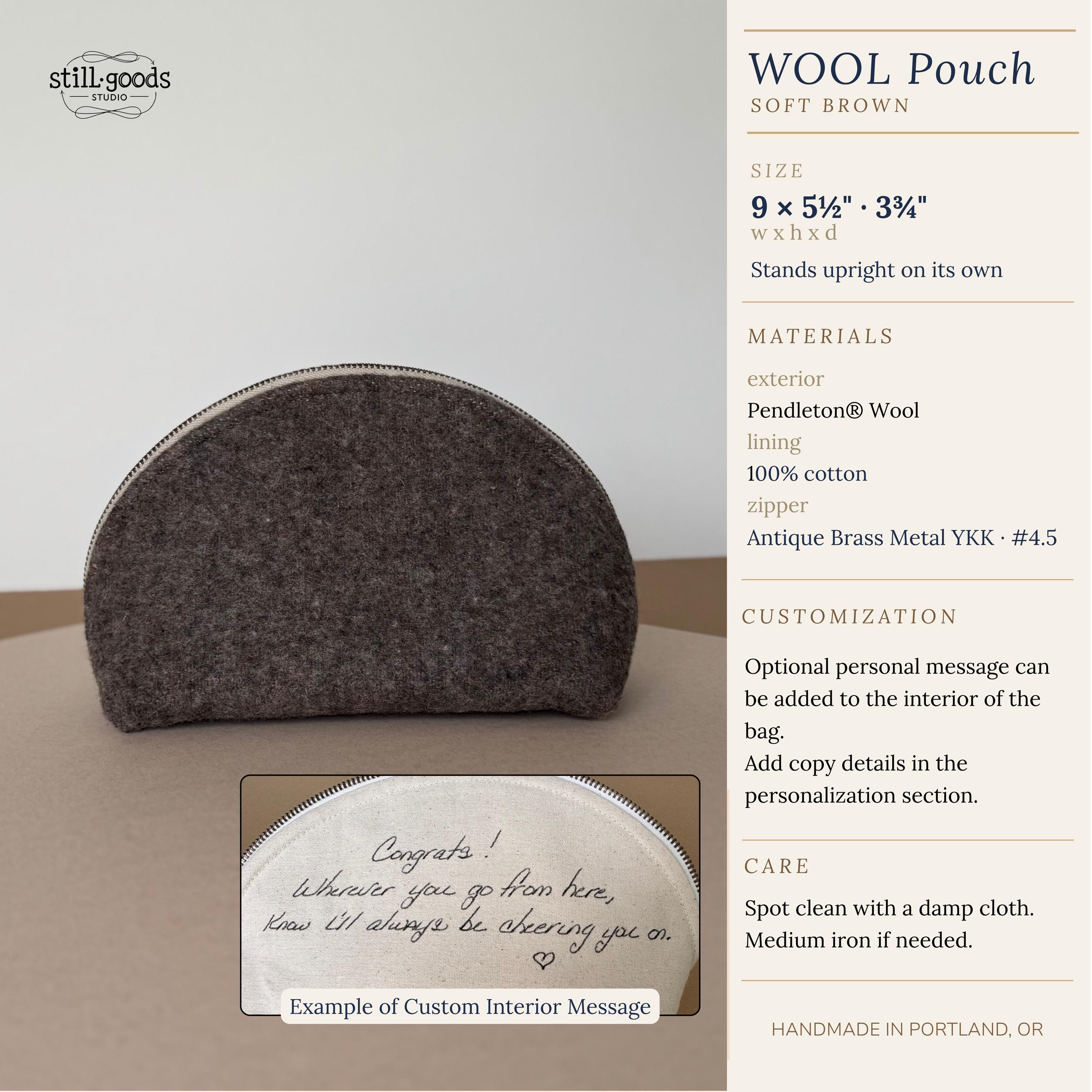- Genuine Pendleton wool exterior in mushroom brown - Half-dome clamshell silhouette — stands upright on its own - Smooth metal zipper with antique brass pull - Taupe fabric interior lining - Optional hand-lettered interior message - One of a kind — this colorway will not be restocked - Approx. 9"w × 5½" h · 3¾" d