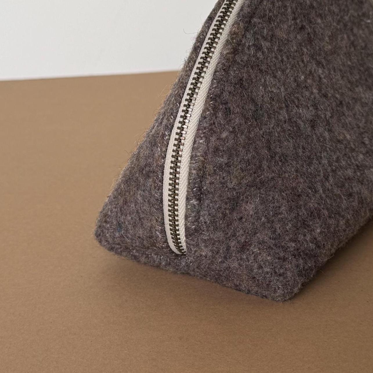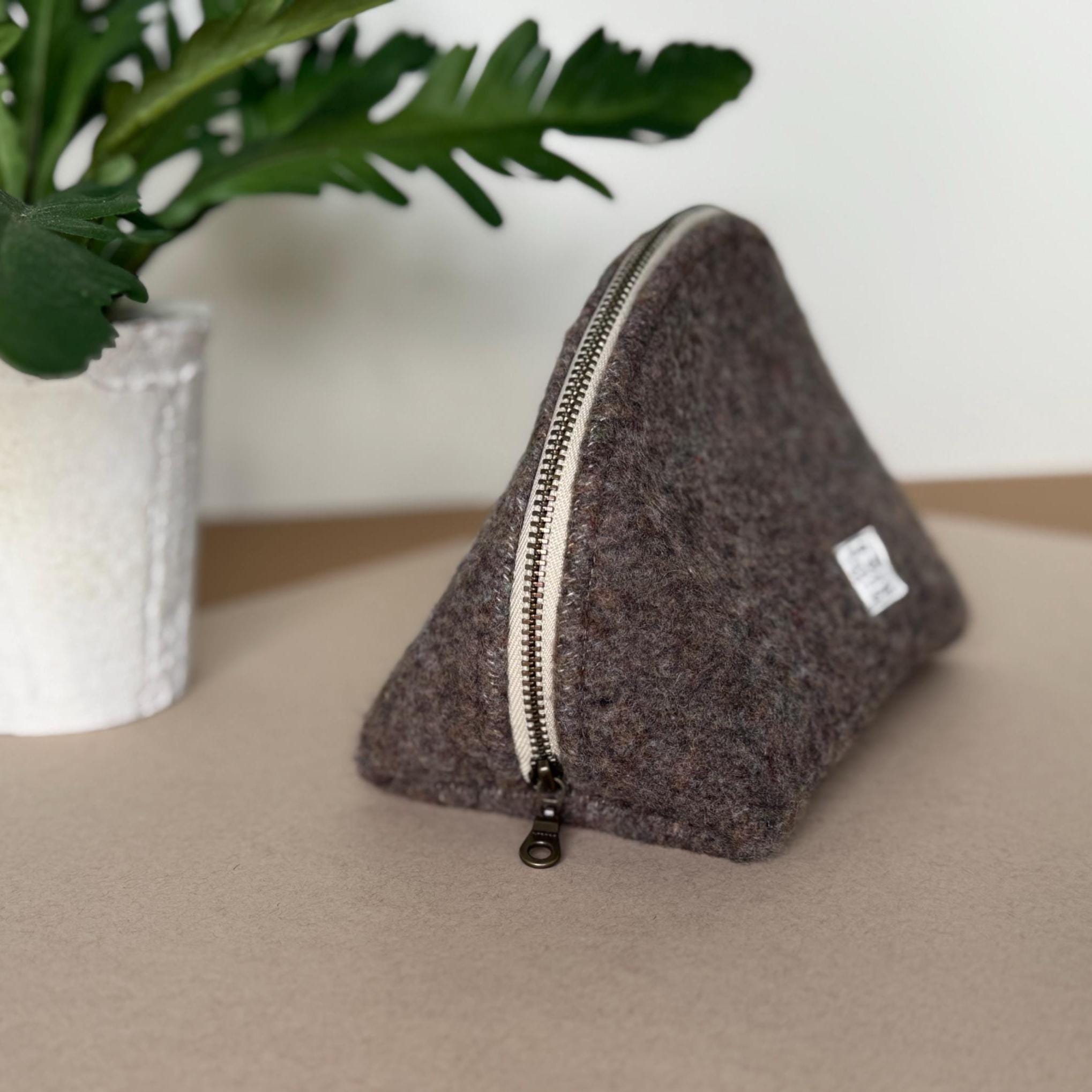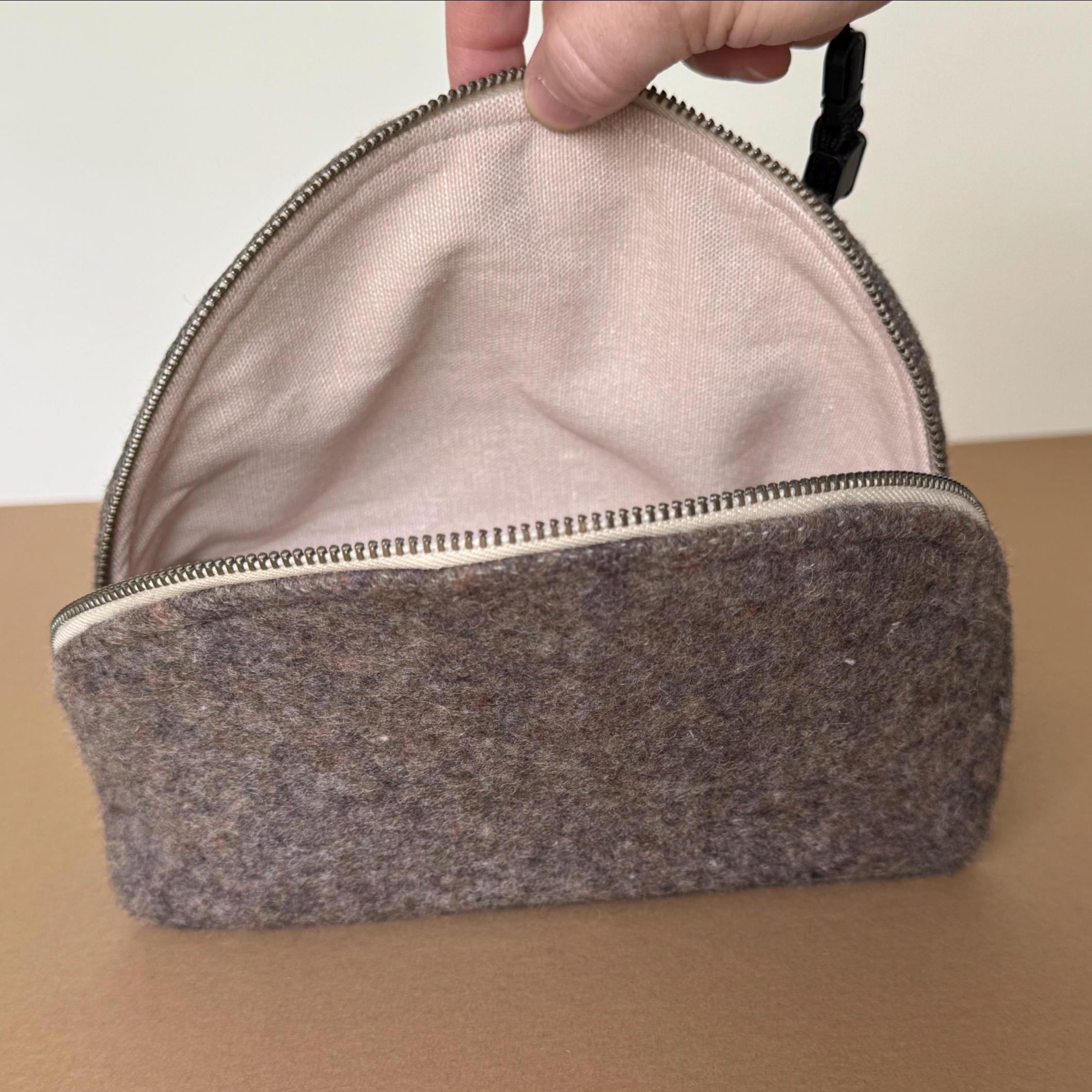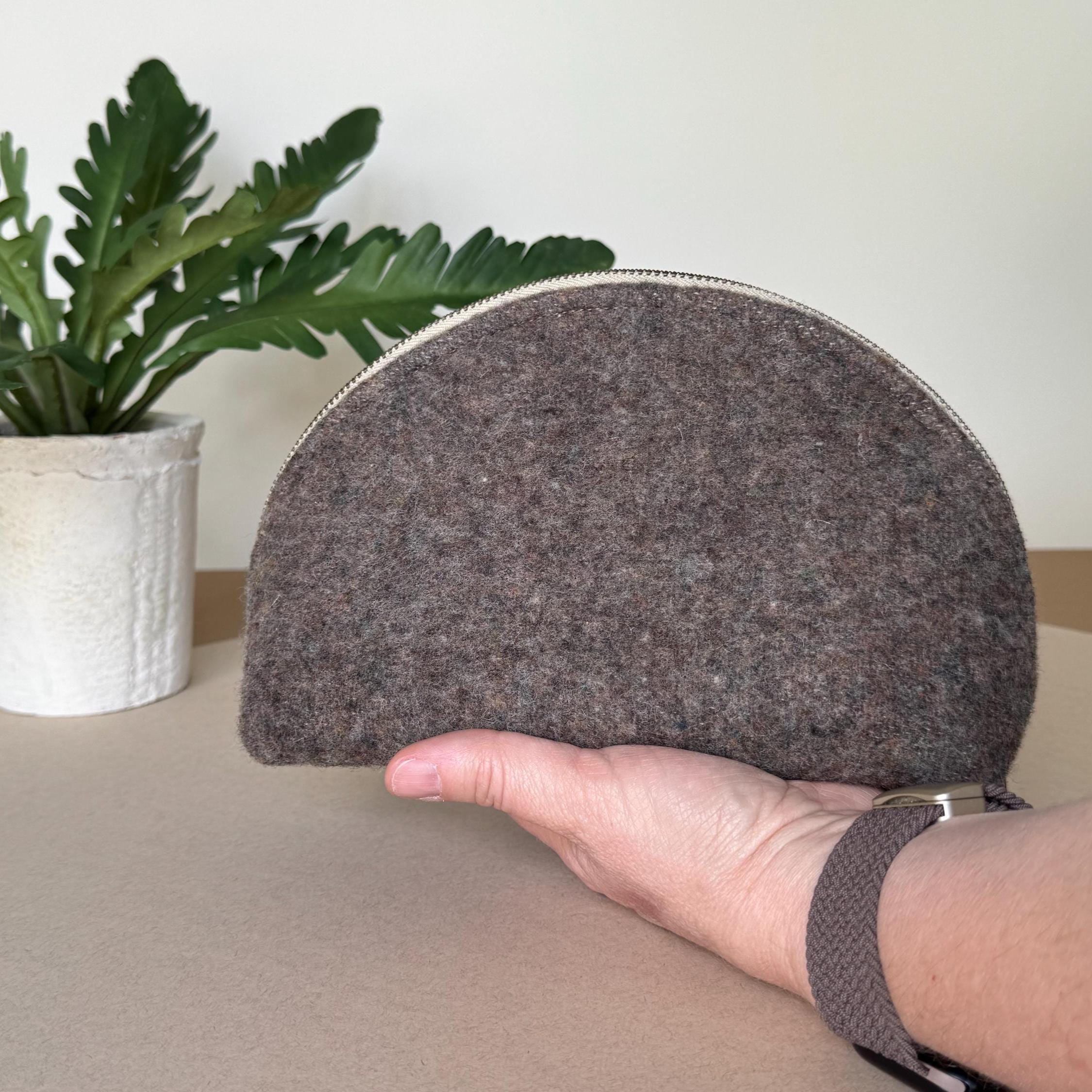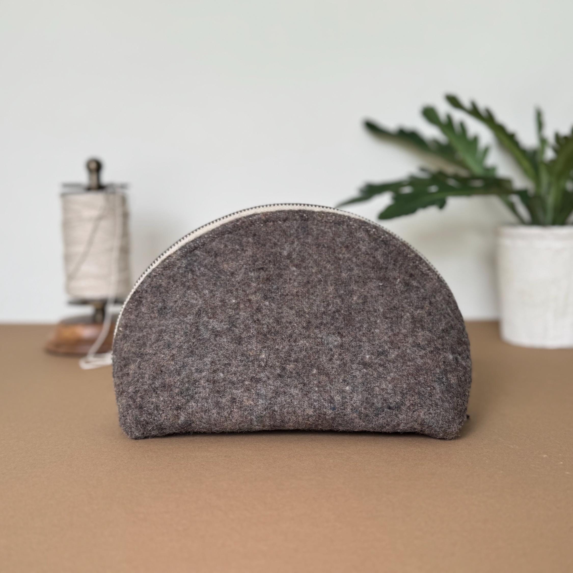 - Genuine Pendleton wool exterior in mushroom brown - Half-dome clamshell silhouette — stands upright on its own - Smooth metal zipper with antique brass pull - Taupe fabric interior lining - Optional hand-lettered interior message - One of a kind — this colorway will not be restocked - Approx. 9"w × 5½" h · 3¾" d