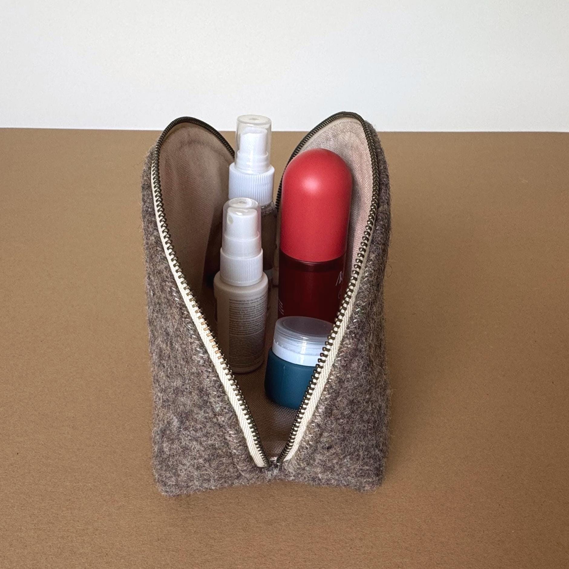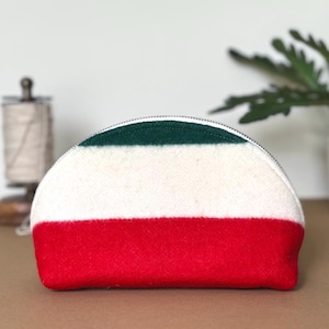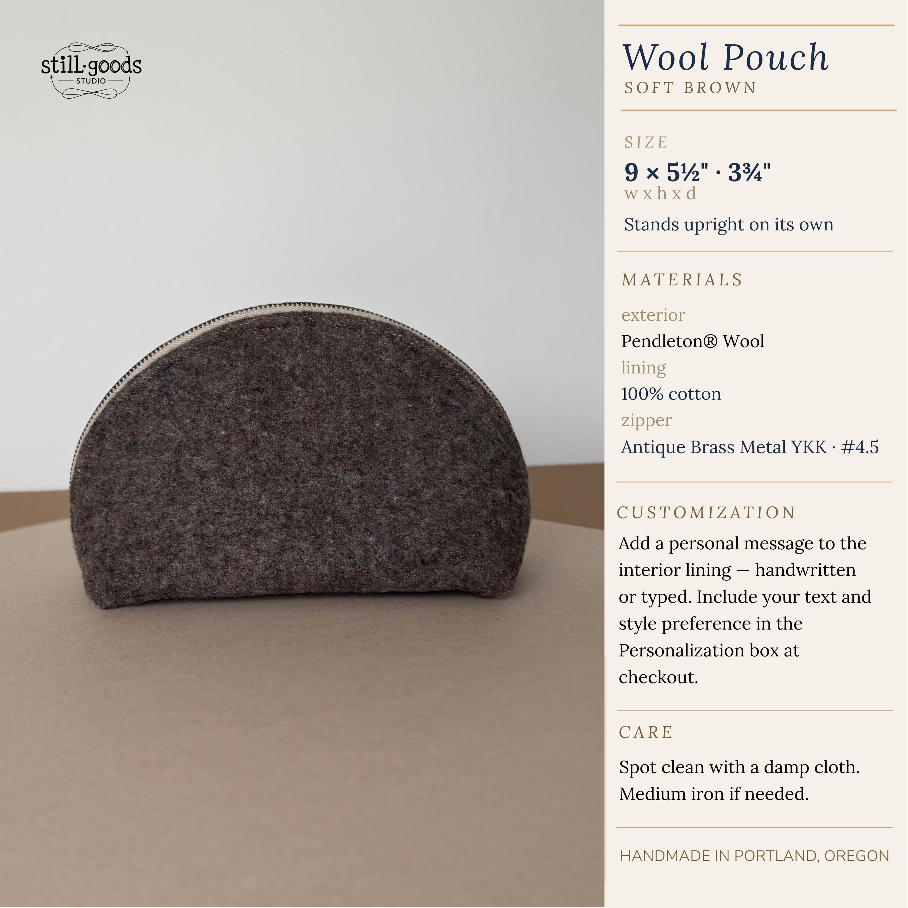 - Genuine Pendleton wool exterior in mushroom brown - Half-dome clamshell silhouette — stands upright on its own - Smooth metal zipper with antique brass pull - Taupe fabric interior lining - Optional hand-lettered interior message - One of a kind — this colorway will not be restocked - Approx. 9"w × 5½" h · 3¾" d