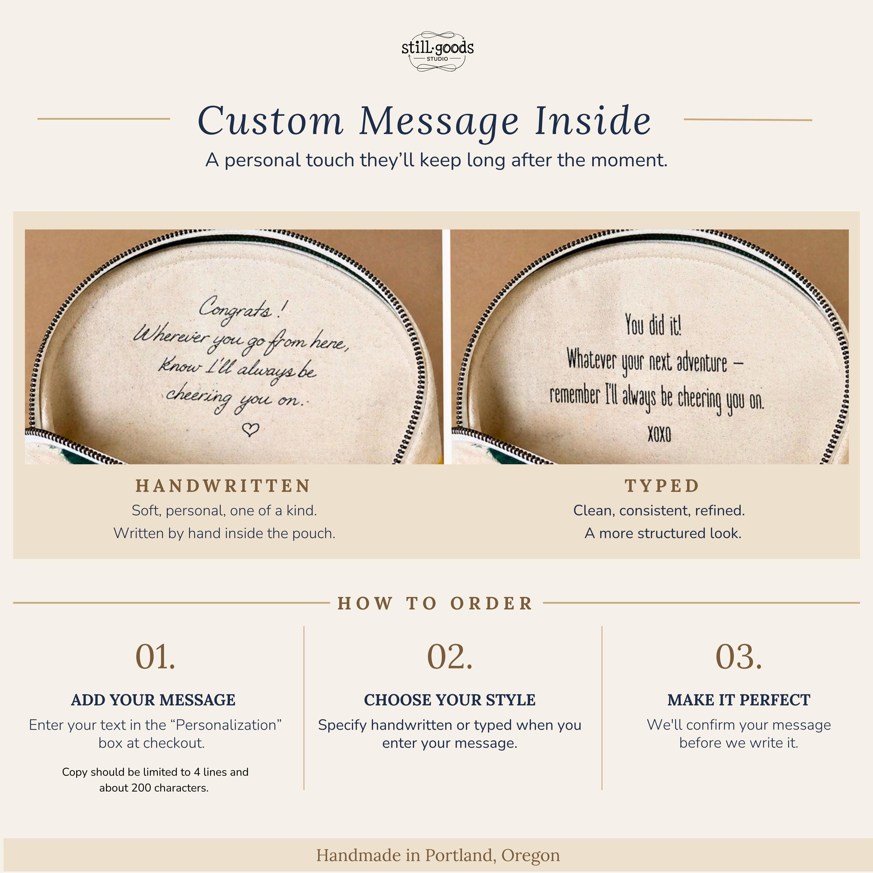 ✦ OPTIONAL INTERIOR MESSAGE Make it personal. Add a handwritten note to the interior lining — your words, written by hand directly on the bag. Just include your message text and format preference in the personalization field at checkout. I'll send a mockup for your approval before anything is finalized.