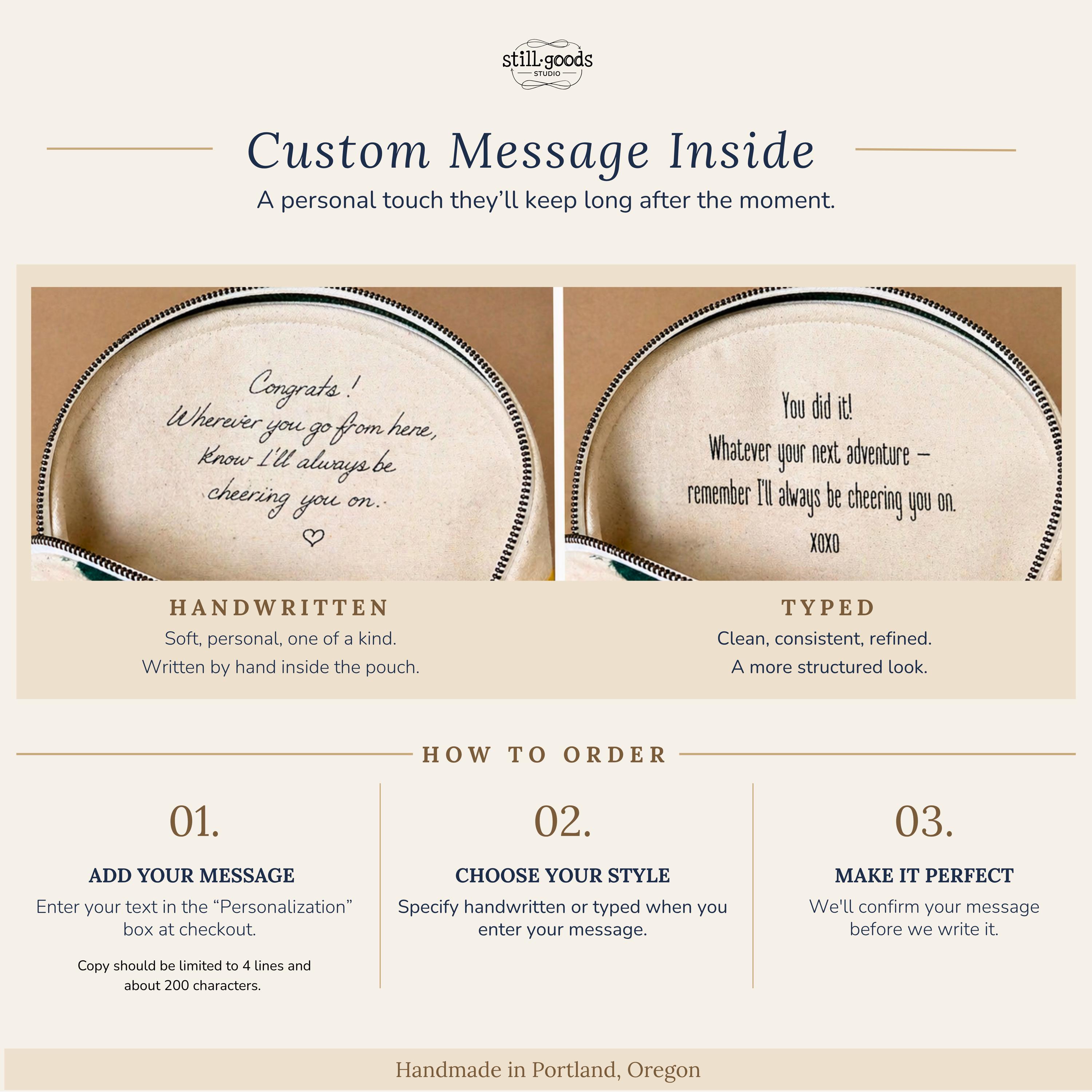 ✦ OPTIONAL INTERIOR MESSAGE — +$10 Make it personal. You can add a custom message to the interior lining — up to 256 characters. The message becomes a lasting piece of the bag. Choose from two formats: