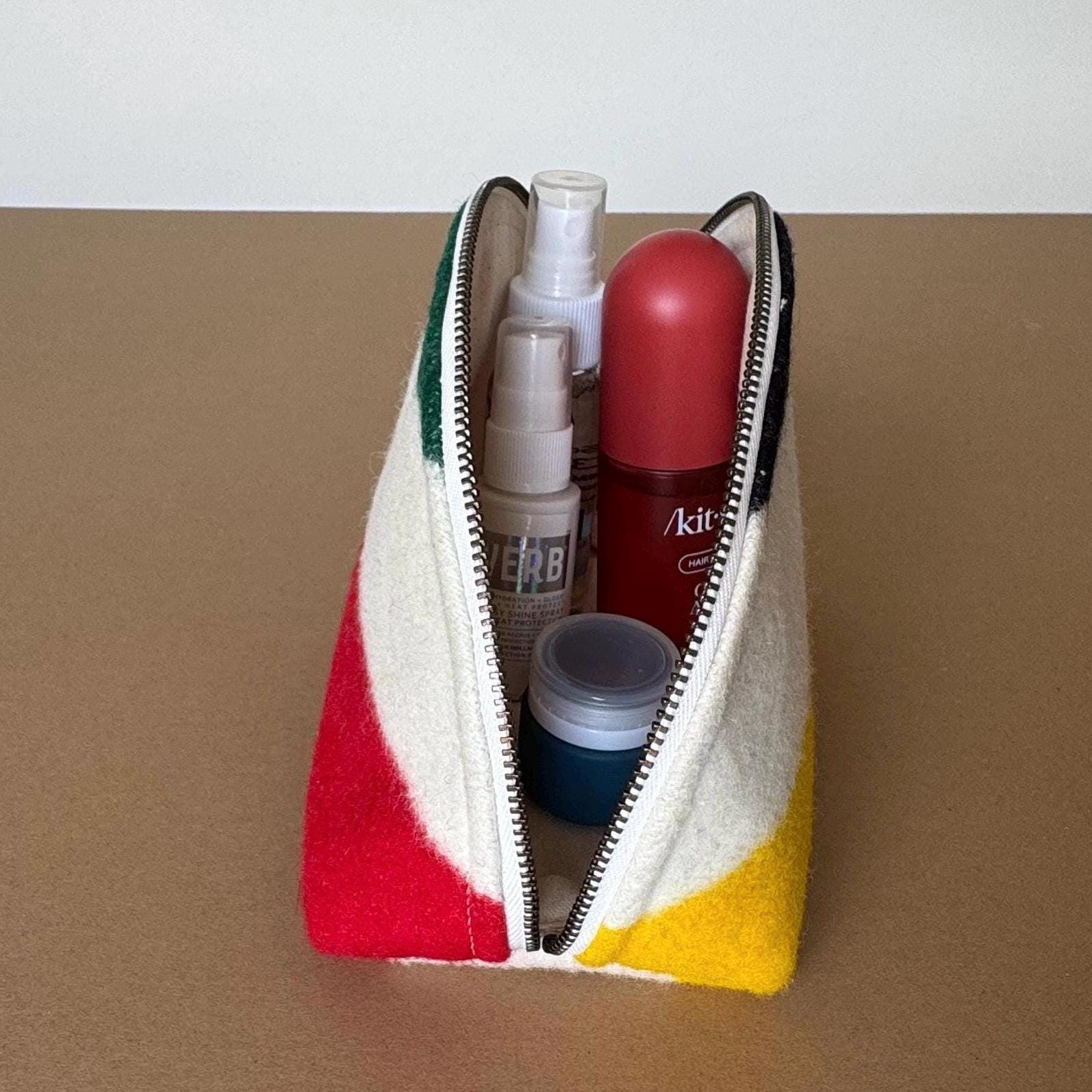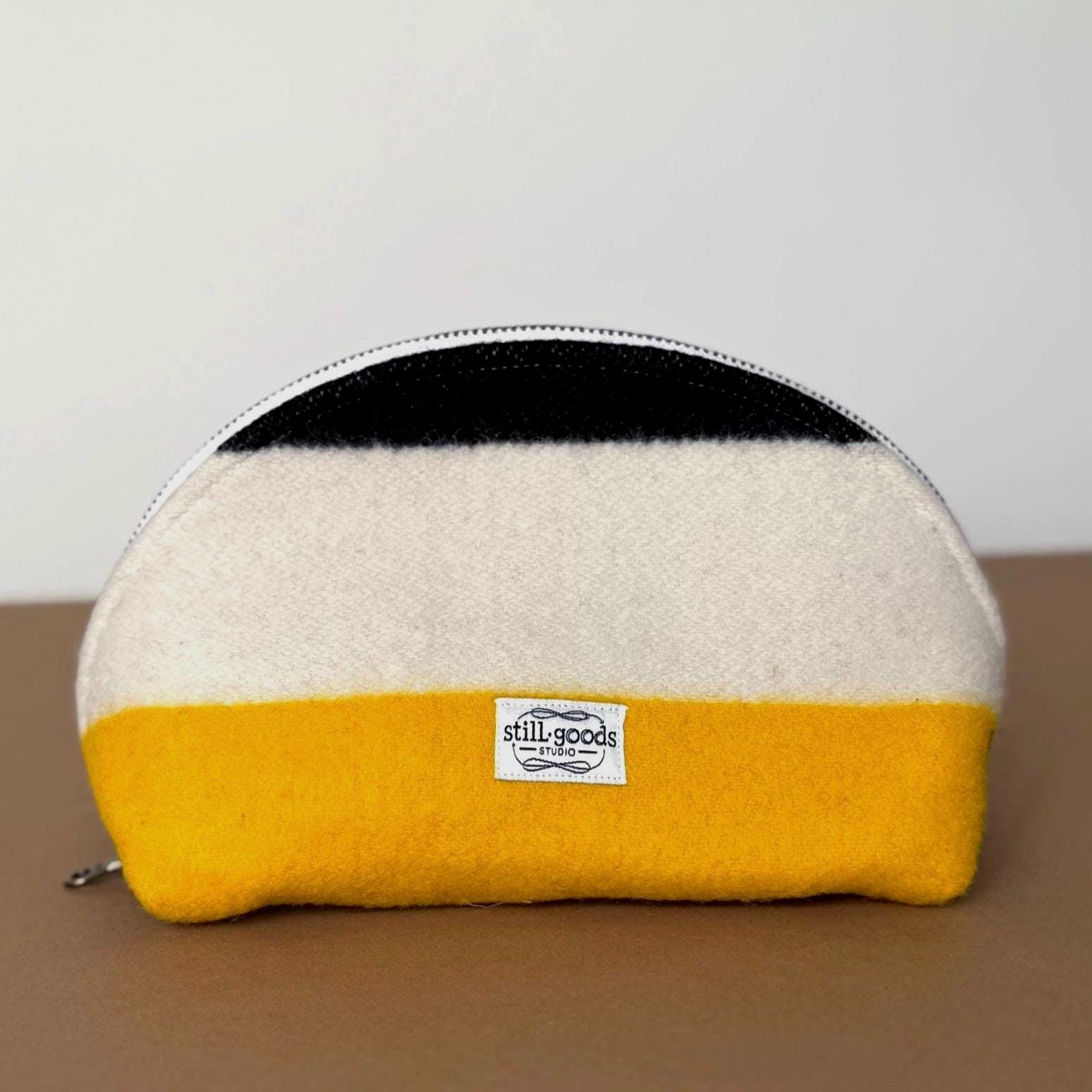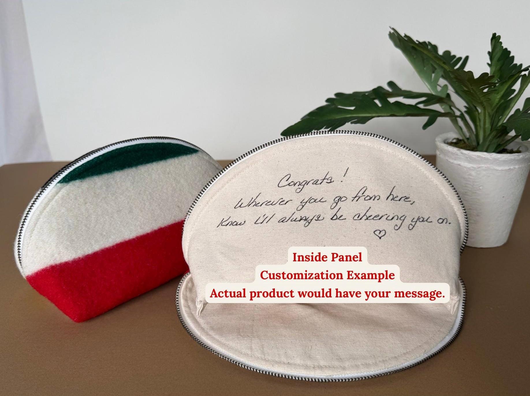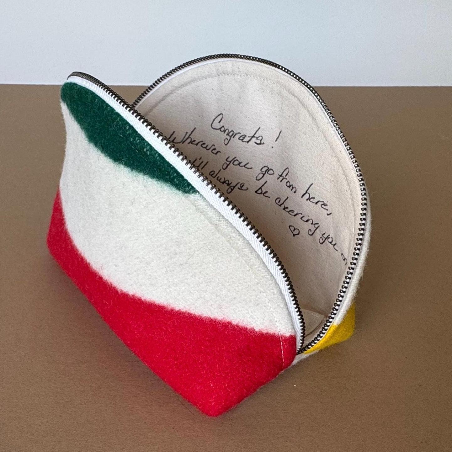 ✦ FEATURES - Genuine Pendleton wool exterior in cream, red, green, and black stripe - Half-dome clamshell silhouette — stands upright on its own - YKK metal zipper with antique brass pull, cream zipper tape - 100% cotton interior lining - Optional hand-lettered or typed interior message (+$10) - Approx. 9" wide × 5 1/2" tall x 3 3/4" deep