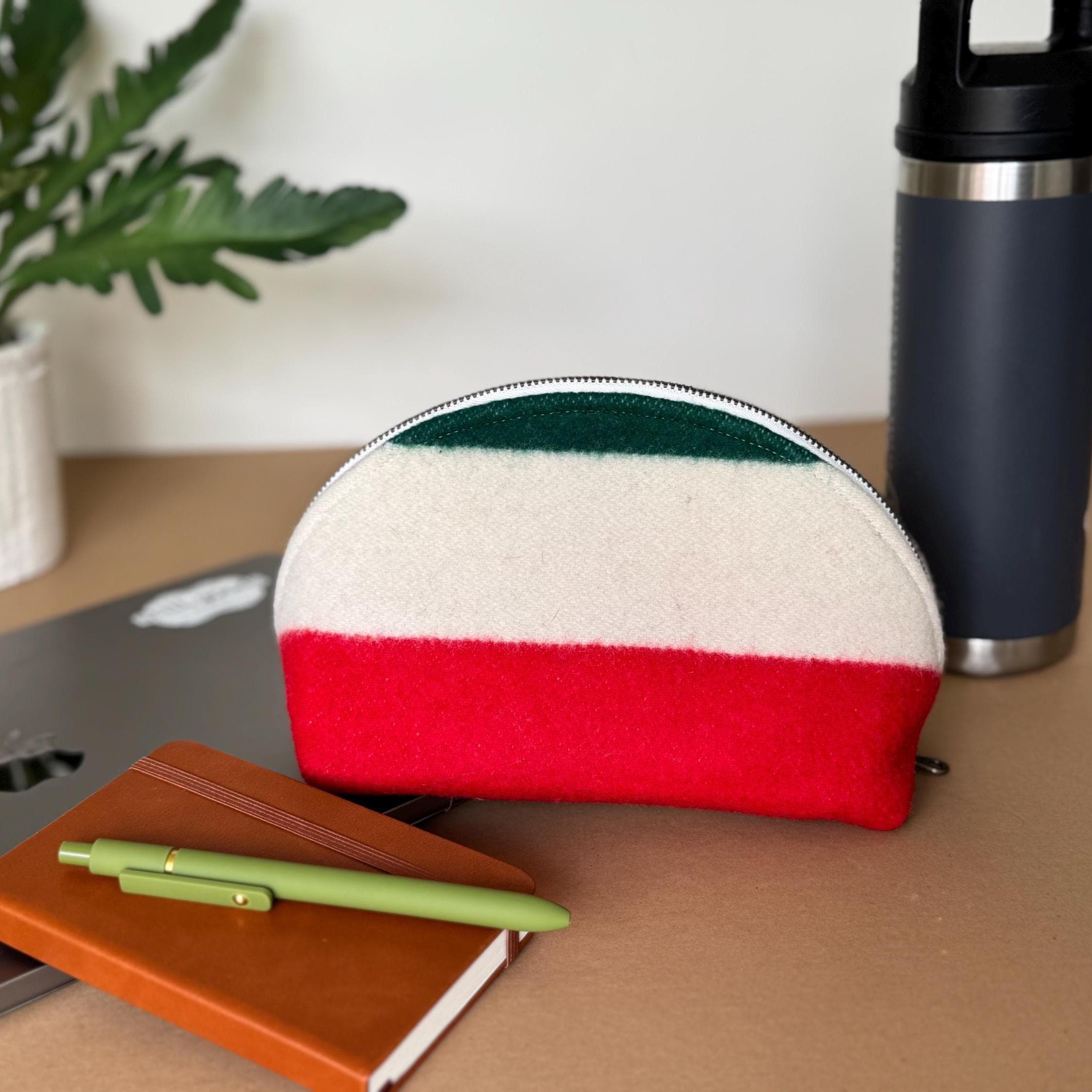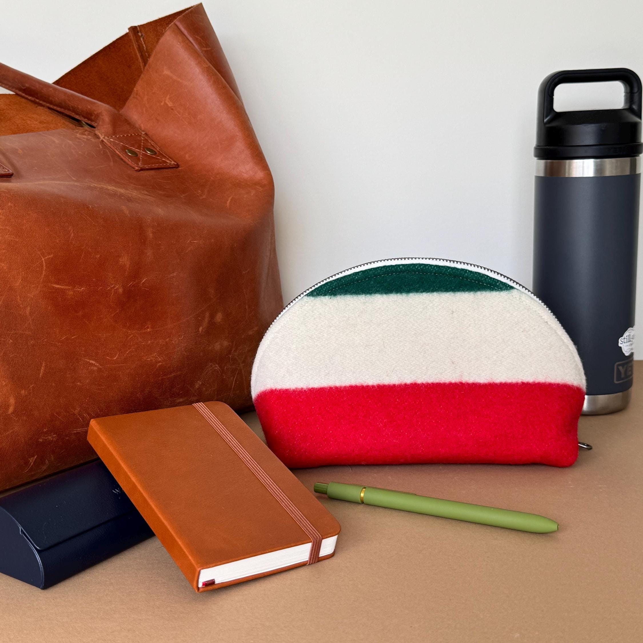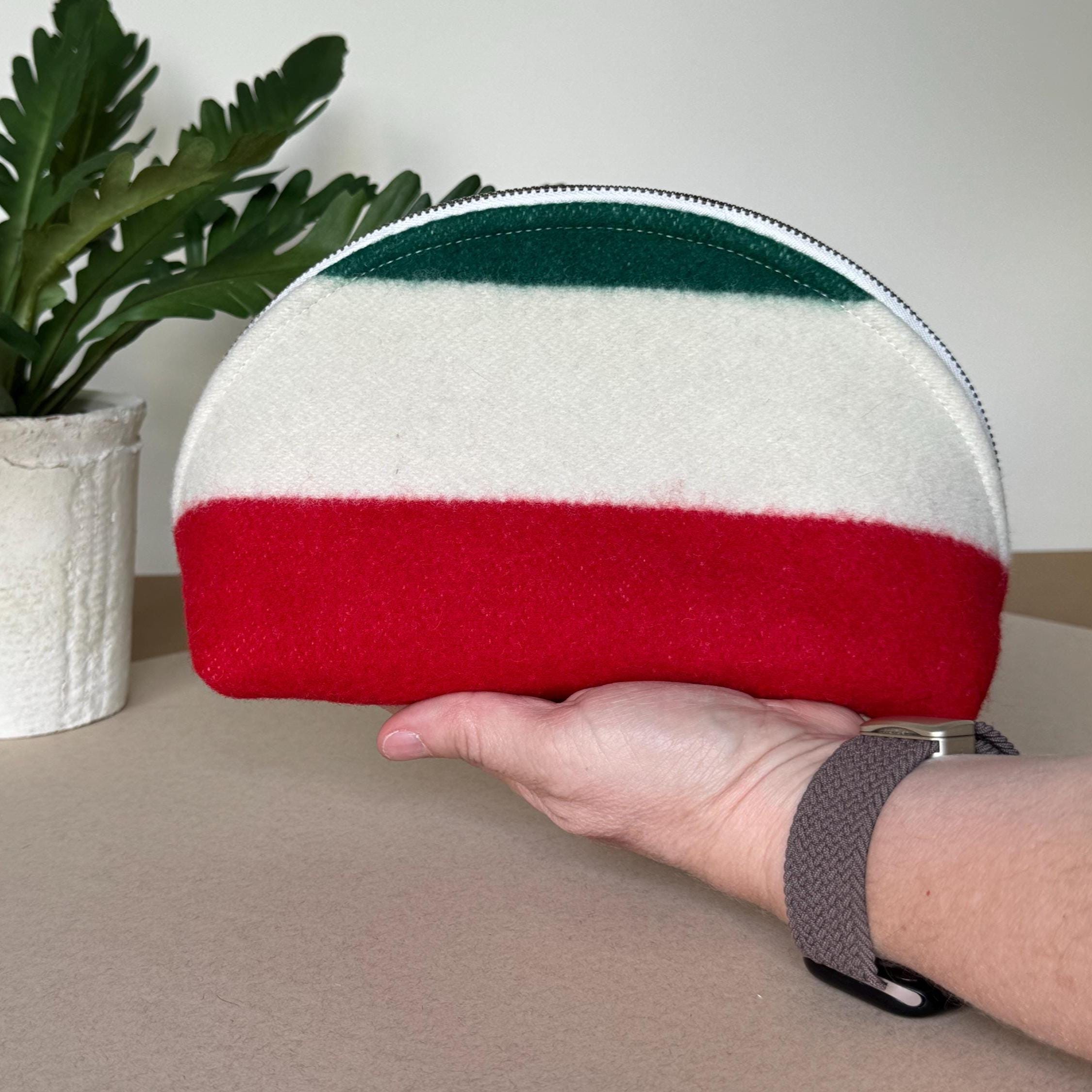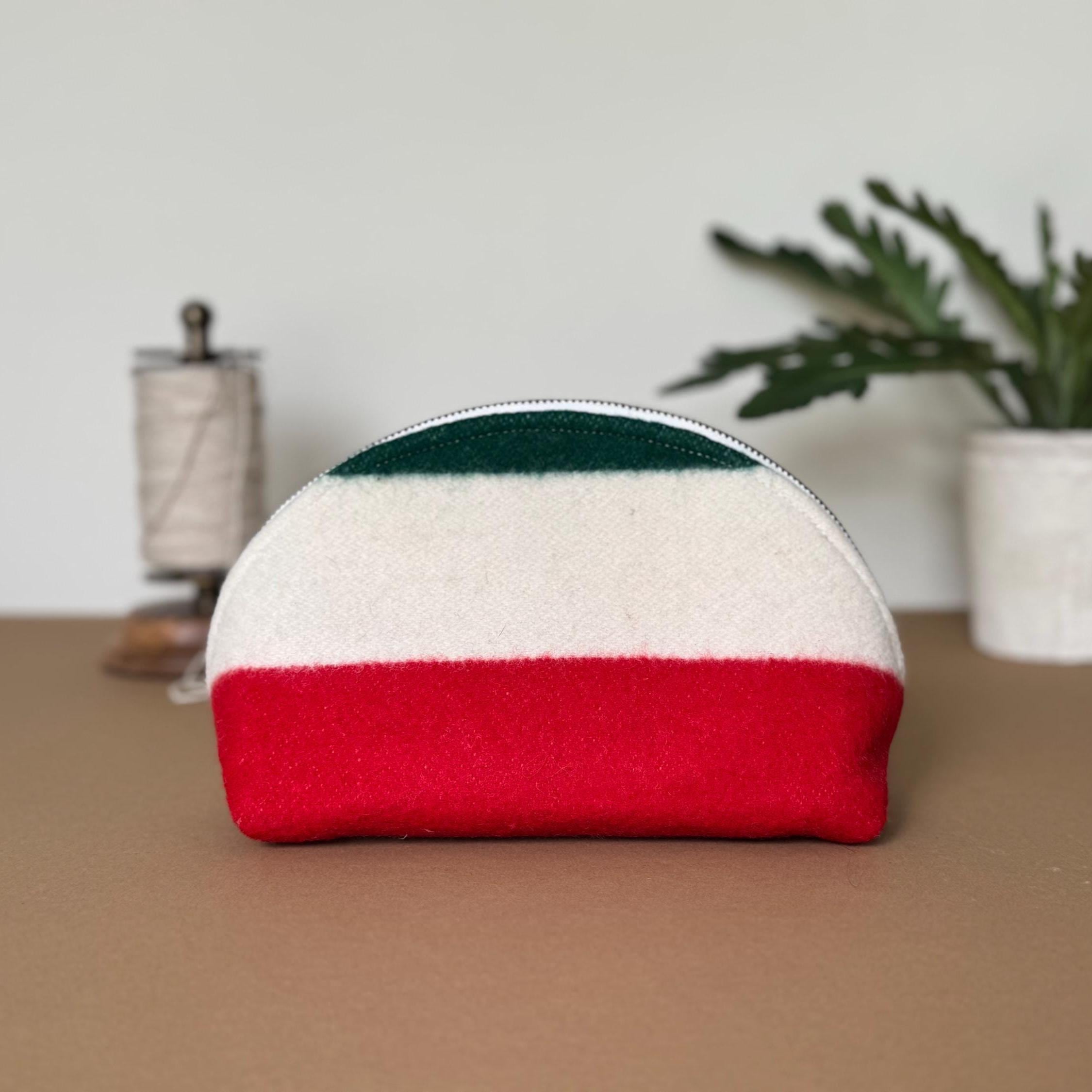 ✦ FEATURES - Genuine Pendleton wool exterior in cream, red, green, and black stripe - Half-dome clamshell silhouette — stands upright on its own - YKK metal zipper with antique brass pull, cream zipper tape - 100% cotton interior lining - Optional hand-lettered or typed interior message (+$10) Approx. 9" wide × 5 1/2" tall x 3 3/4" deep