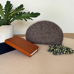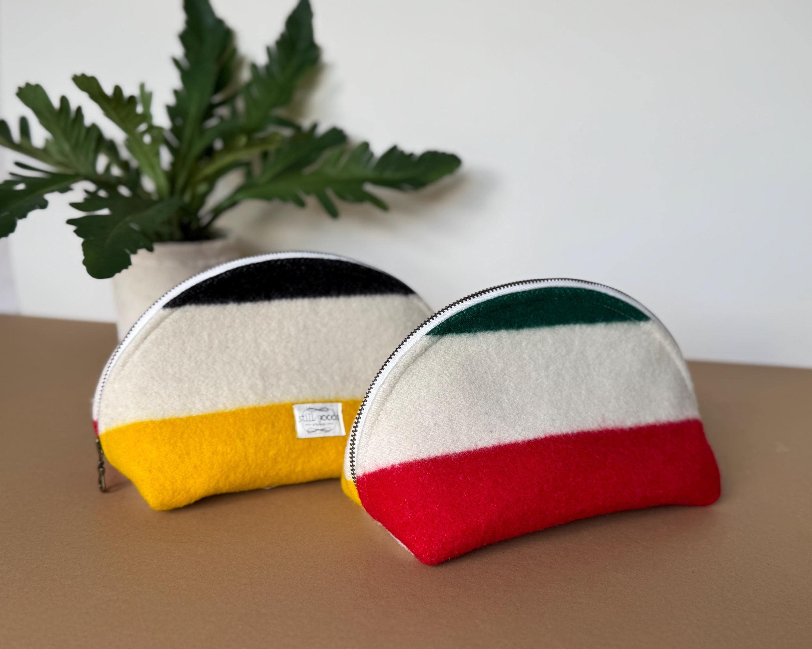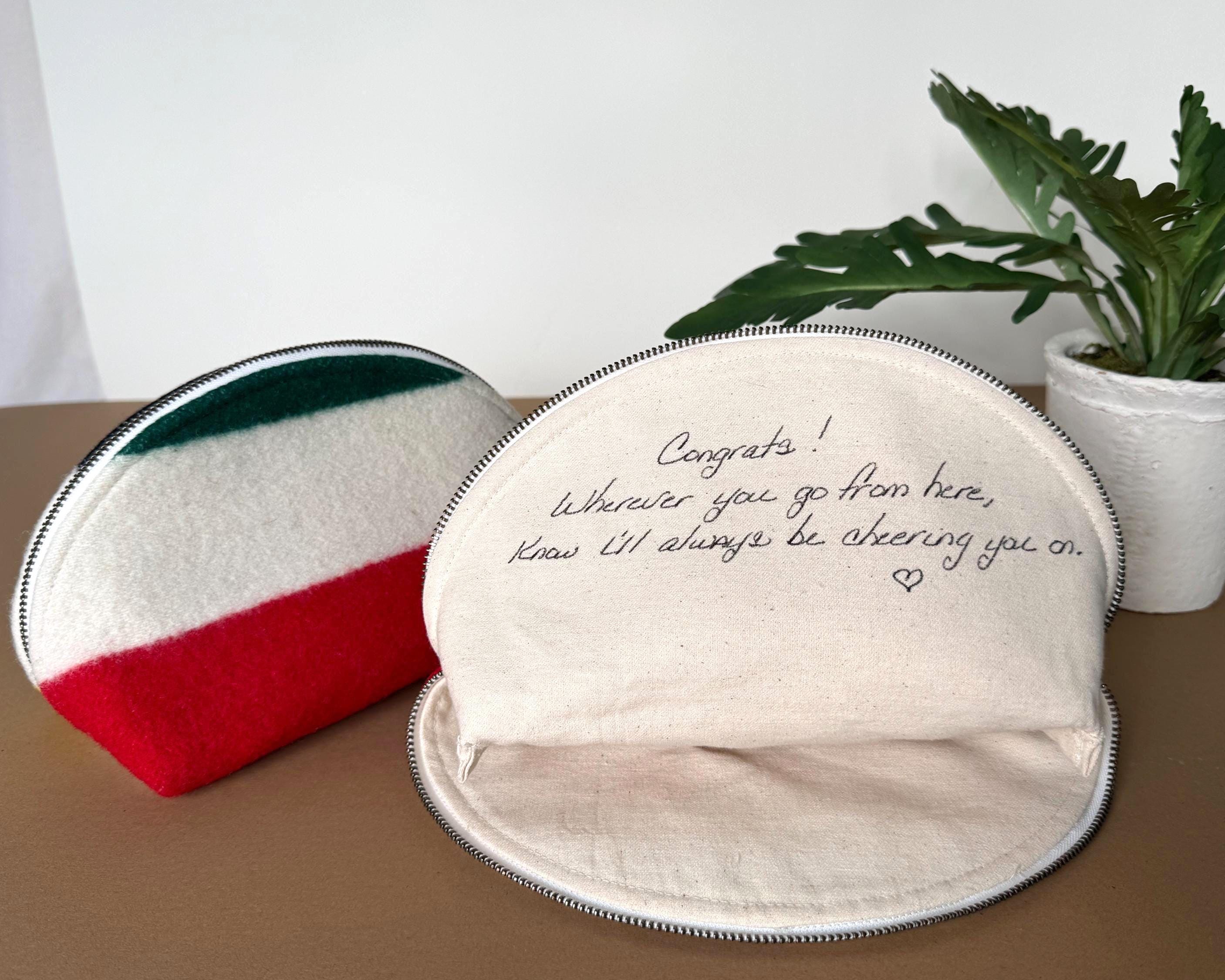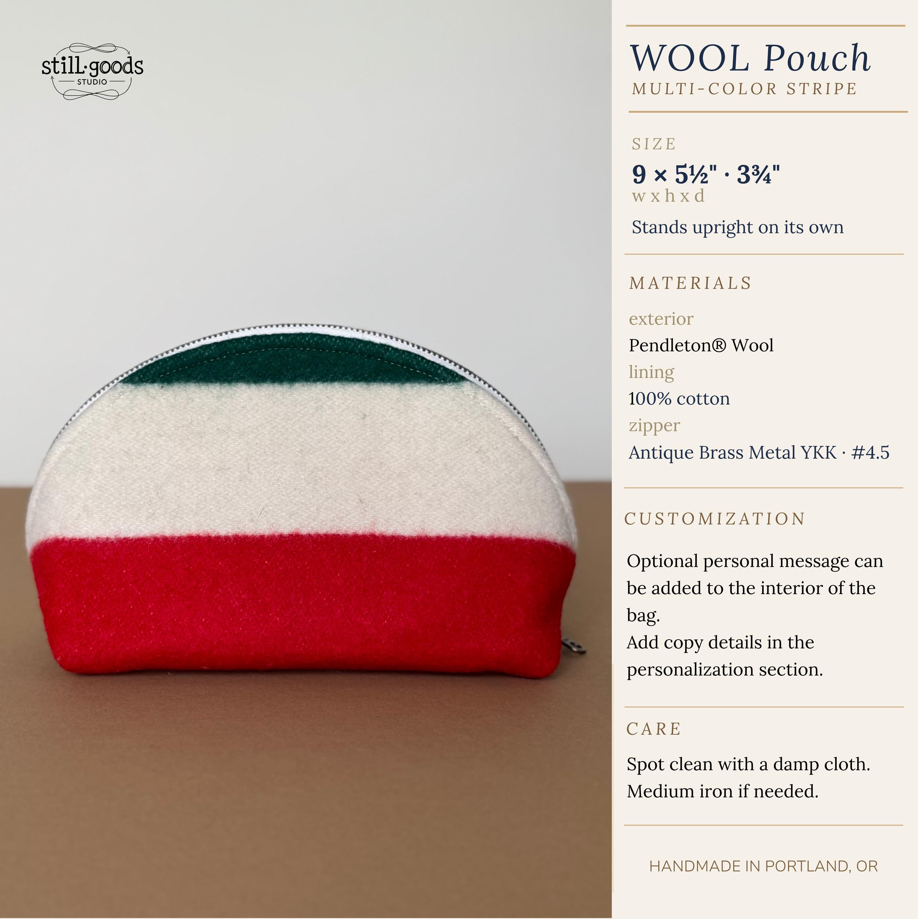 ✦ FEATURES - Genuine Pendleton wool exterior in cream, red, green, and black stripe - Half-dome clamshell silhouette — stands upright on its own - YKK metal zipper with antique brass pull, cream zipper tape - 100% cotton interior lining - Optional hand-lettered or typed interior message (+$10) Approx. 9" wide × 5 1/2" tall x 3 3/4" deep
