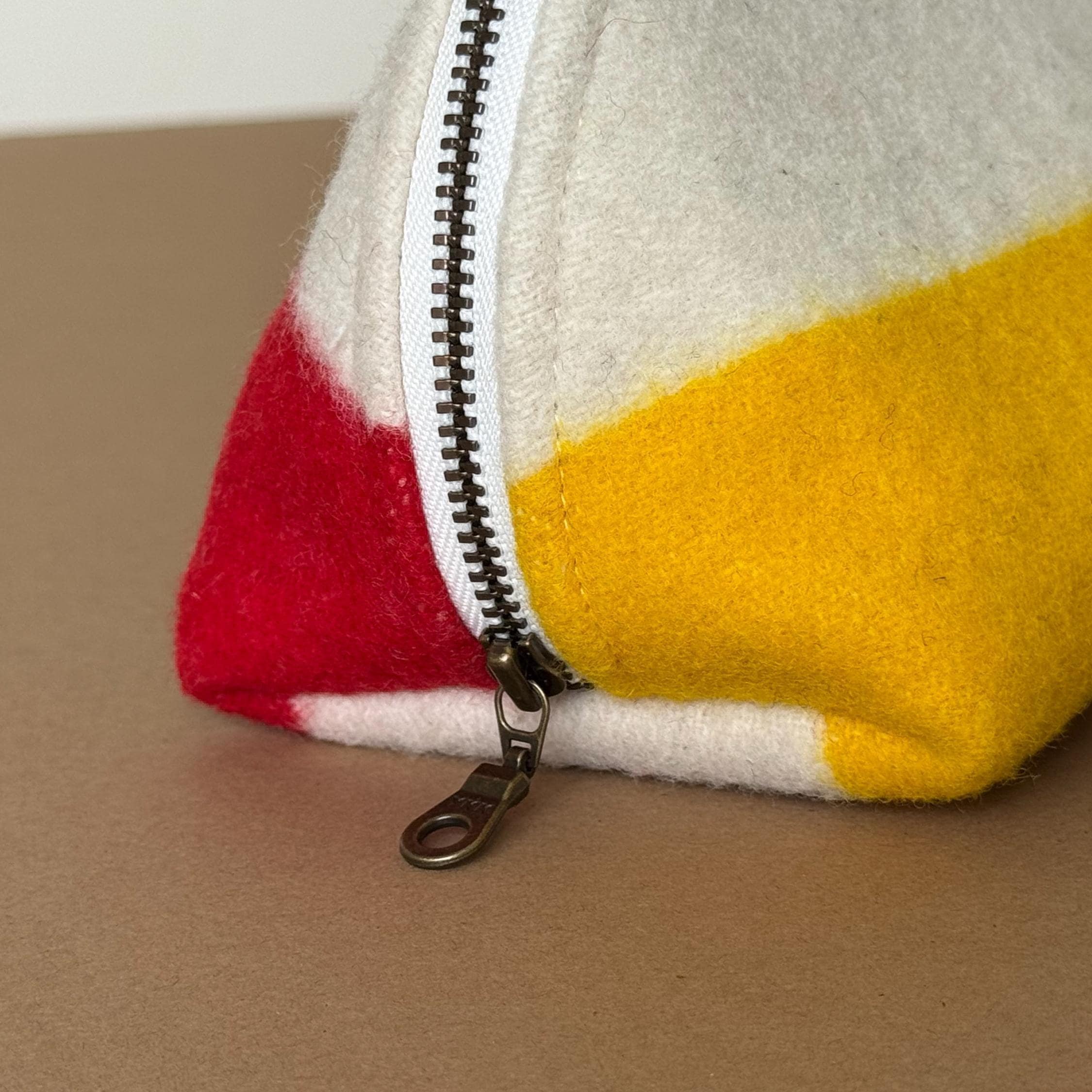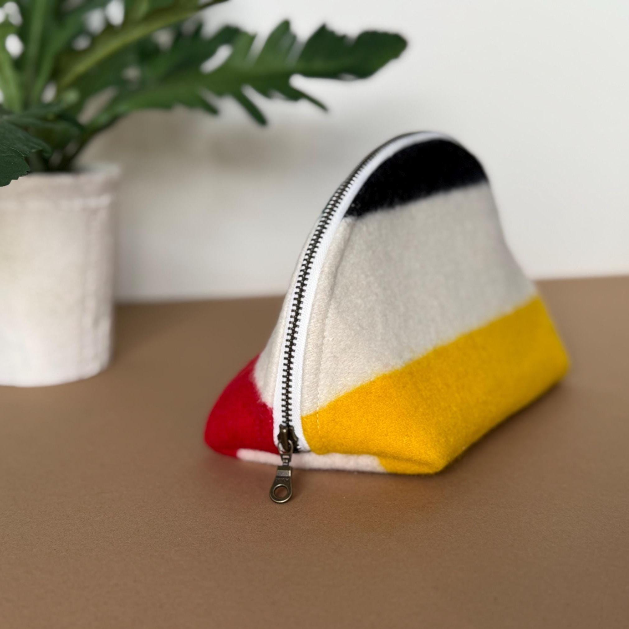A bag that announces itself. This clamshell pouch is cut from genuine Pendleton wool in a bold cream, red, green, and black stripe — graphic and warm at the same time. The half-dome shape sits upright on its own, zips closed with a smooth YKK metal zipper with antique brass pull, and is lined in cream cotton with room for your daily essentials. Six available — made from the same run of fabric, consistent stripe placement across all bags.